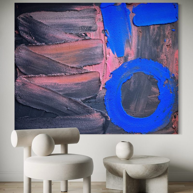 This original painting with it’s intriguing mark making and subtle calming palette of warm ochre and mustard yellow, mauve and white, is the perfect statement piece for a large space.