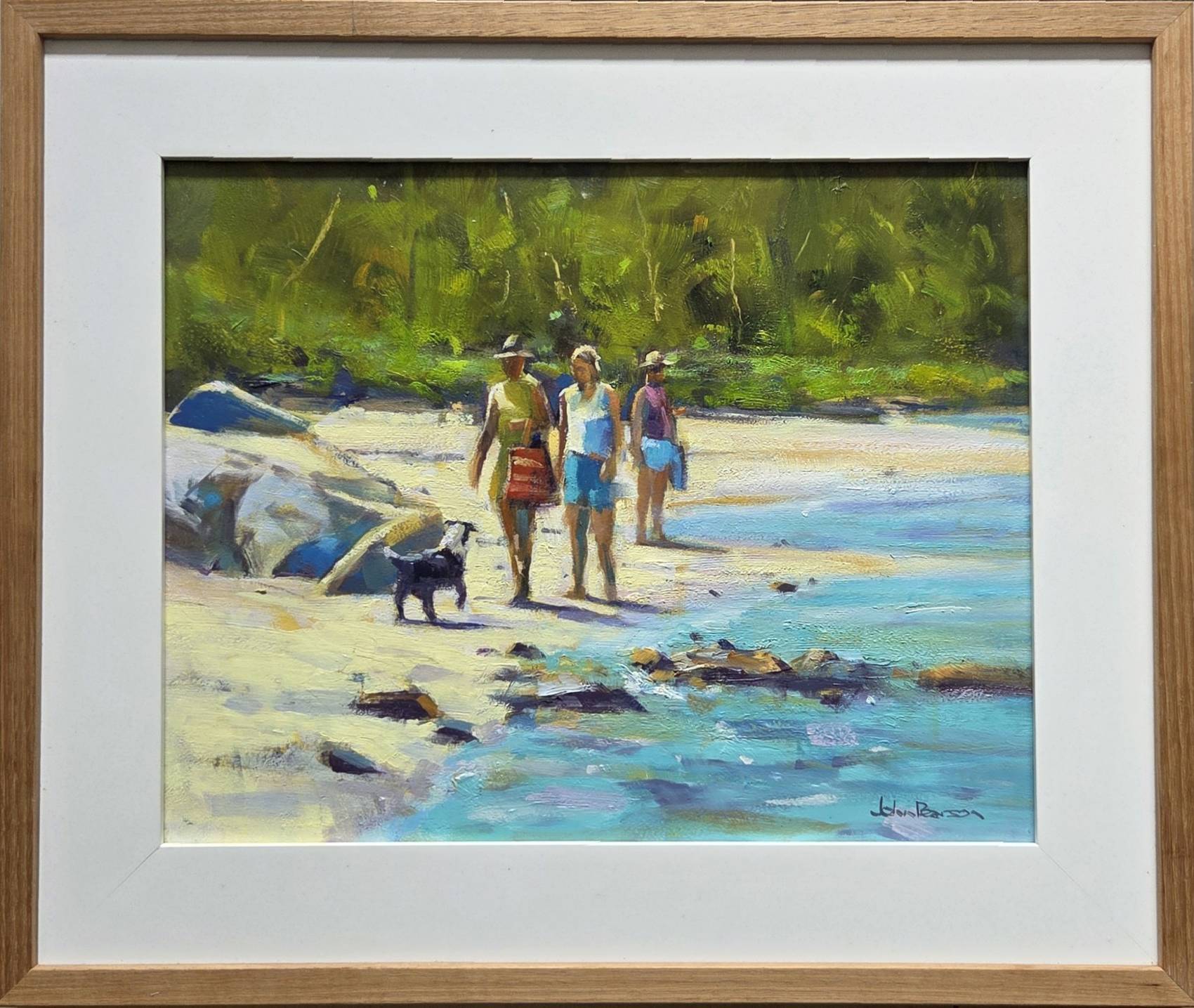 Feeling So Fine is an original oil painting by John Pearson – Three friends walk along the beach with their dog in the afternoon sunshine. Â Framed dimensions shown.