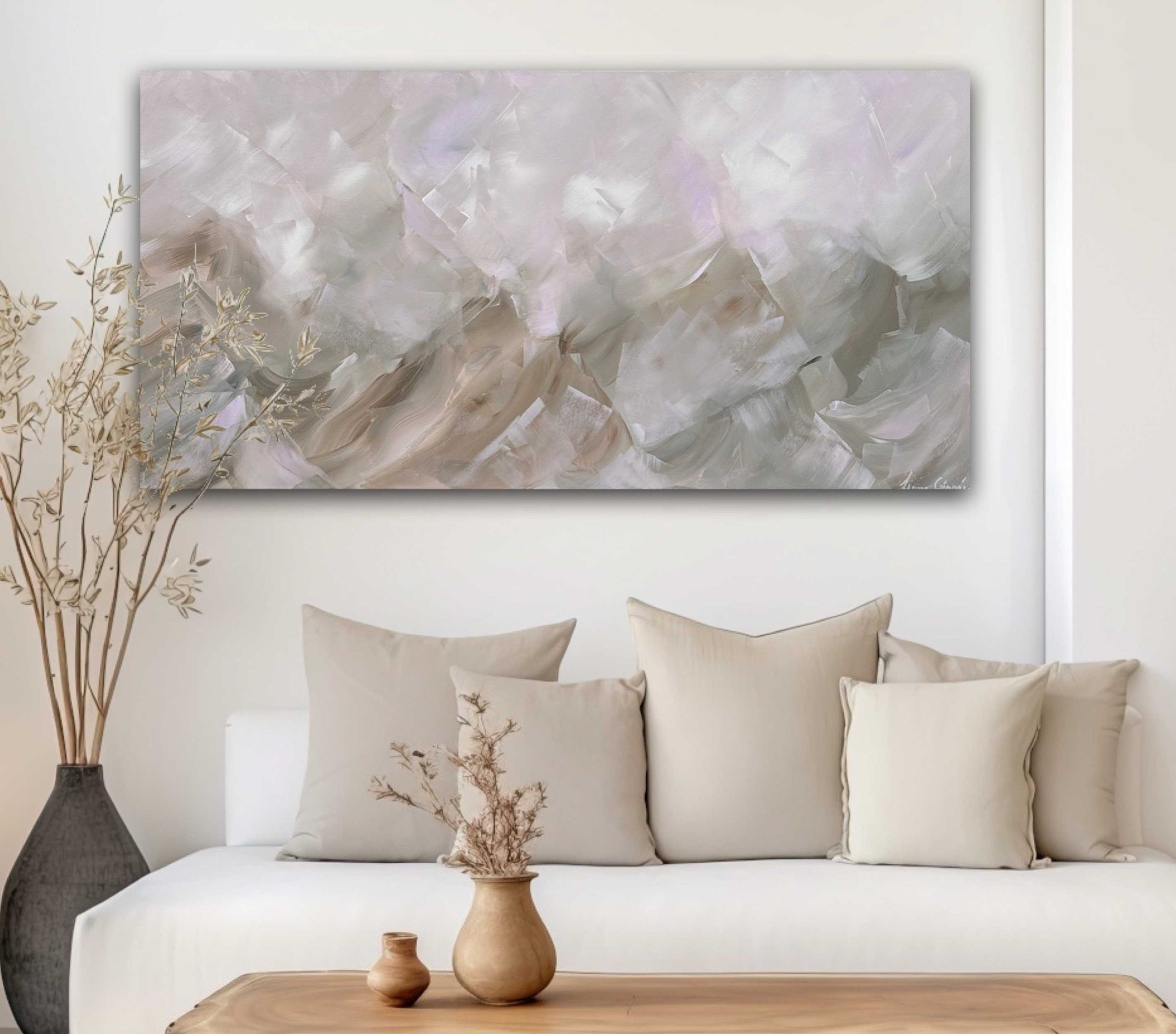 Neutral tones highlight the soft and calming nature of ‘Feels Like Spring No 102’. This piece was inspired by times of hope and happiness. A calming artwork, full of light, that adds a sense of peace to any space.