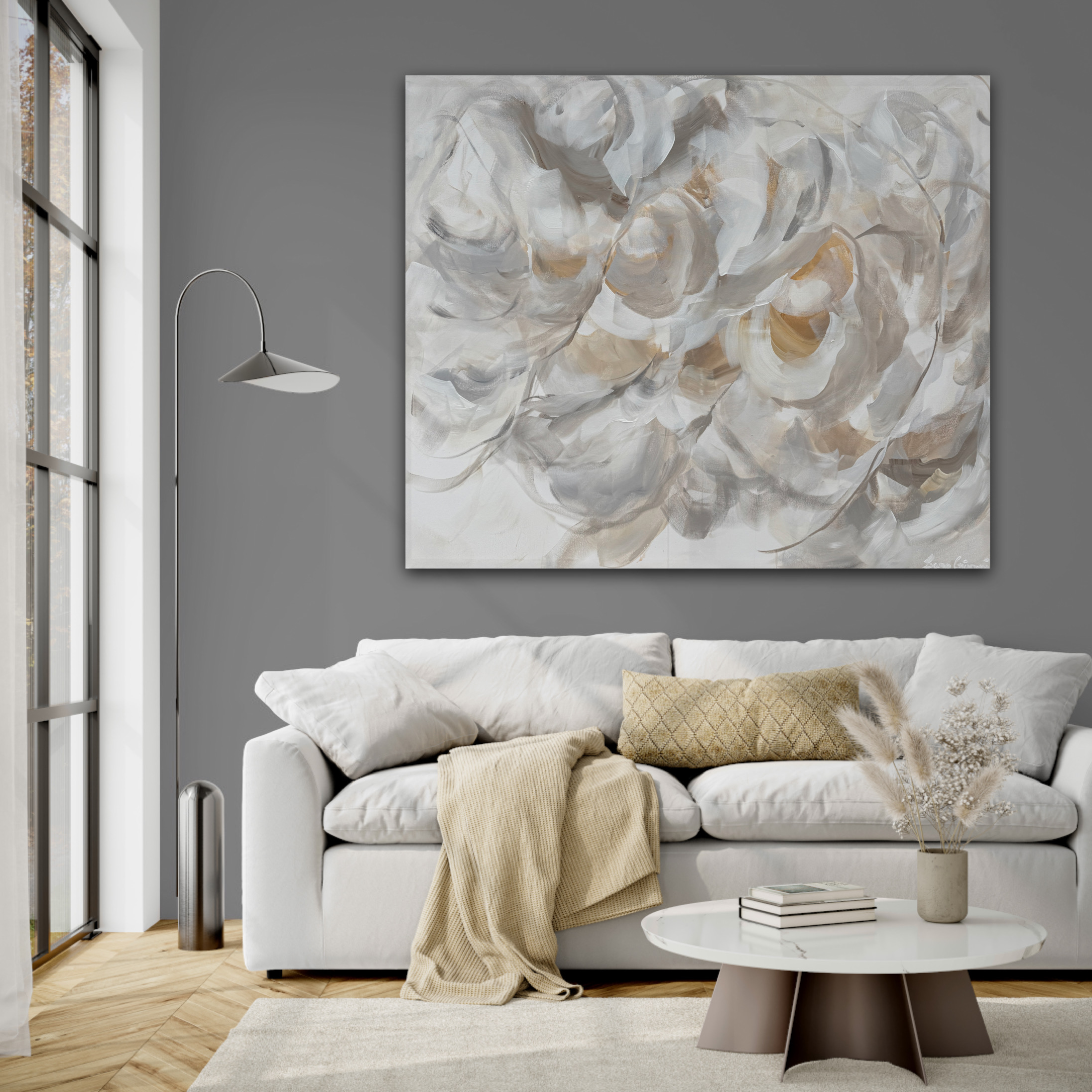 ‘Feels Like Spring No 108’ features an elegant and serene abstract floral composition in a neutral colour palette. Soft flowing brushstrokes create an illusion of delicate petals in shades of white, beige and taupe. Perfect for modern, minimal or classic interiors.