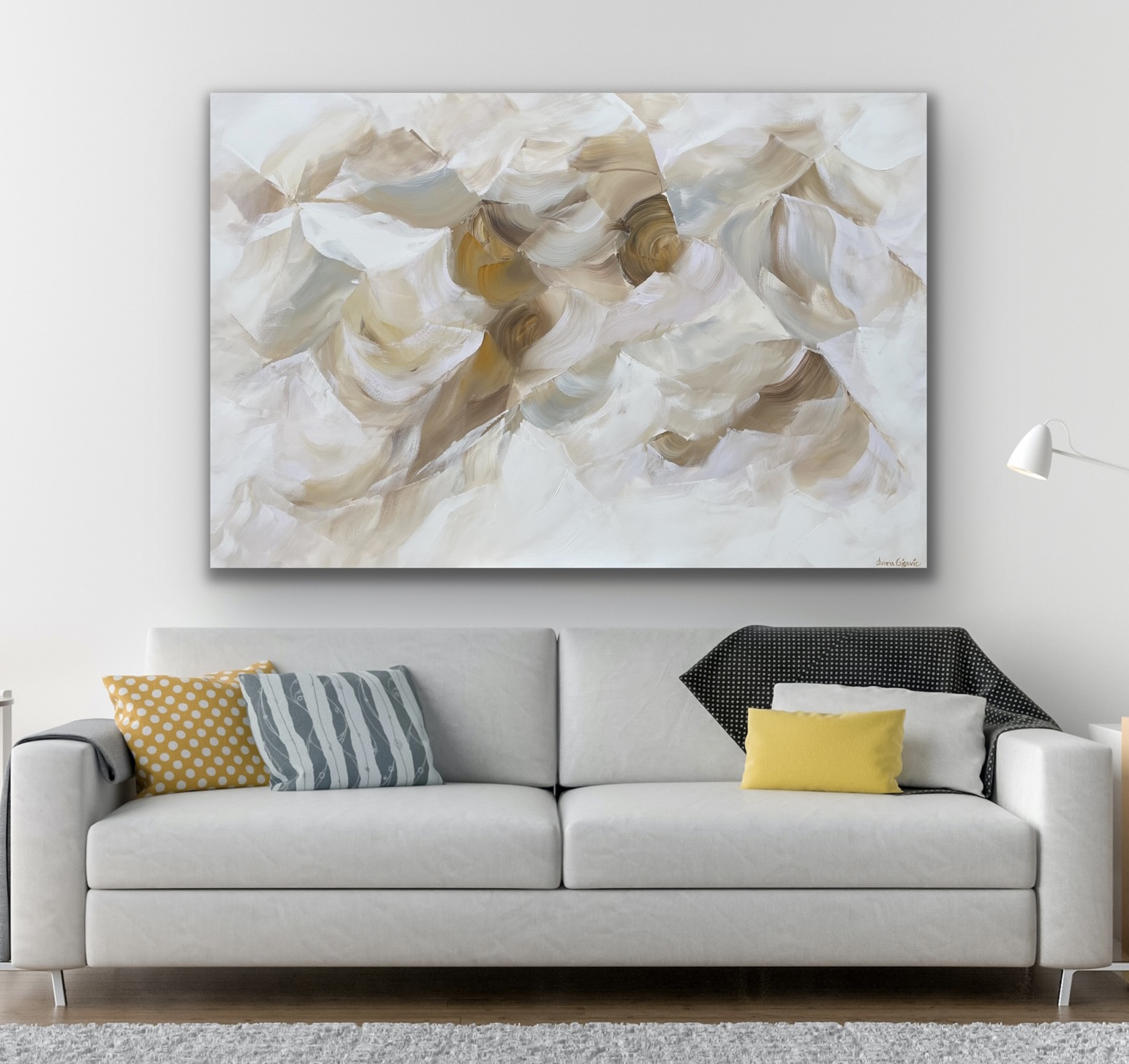 The latest addition to my ‘Feels Like Spring’ series is a modern artwork with a fresh and calm feel featuring soft shades of grey and beige. Soft shades of lilac and white add a touch of light throughout.