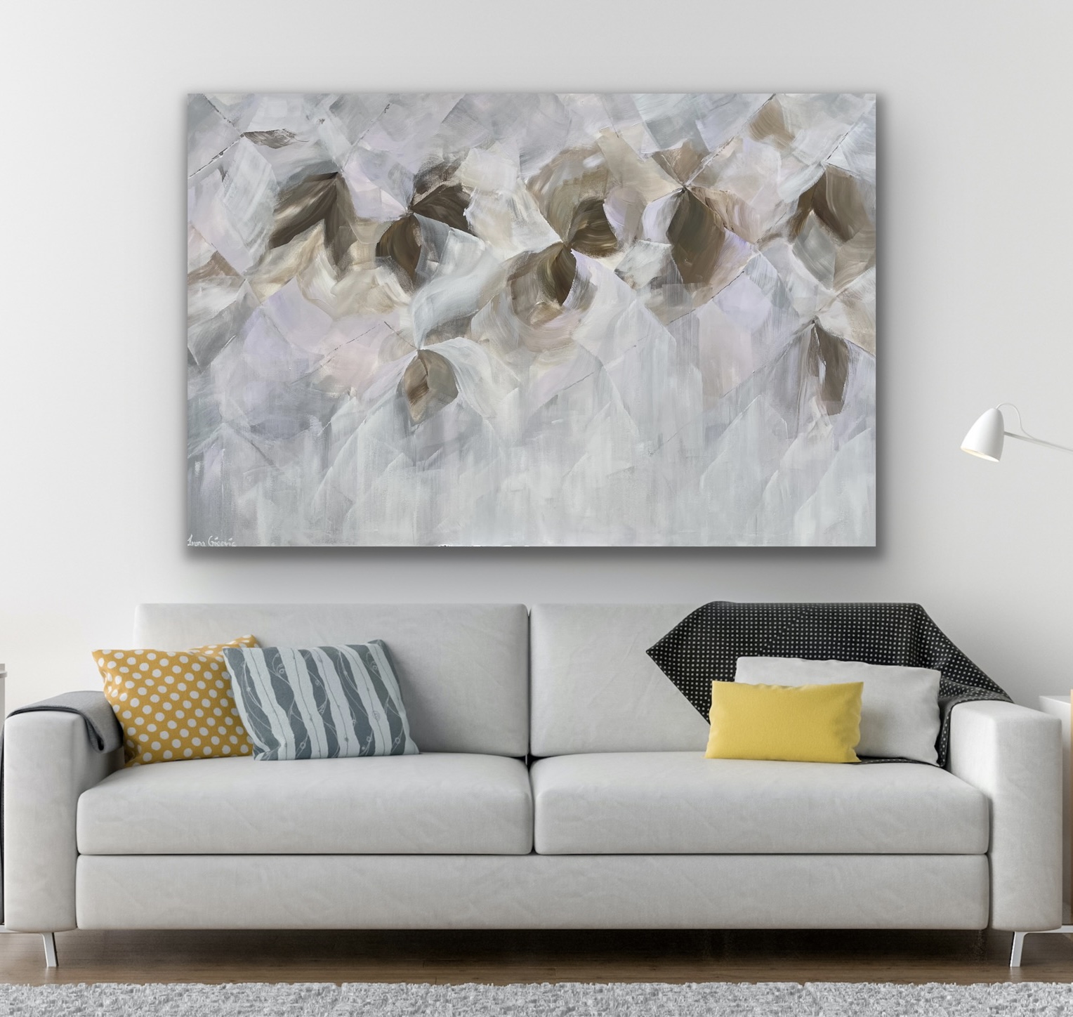 Shades of gray and soft brown give this artwork dimension and depth. A touch of lilac adds light and freshness. A lovely statement contemporary piece that will add a sense of calm and joy to any room.