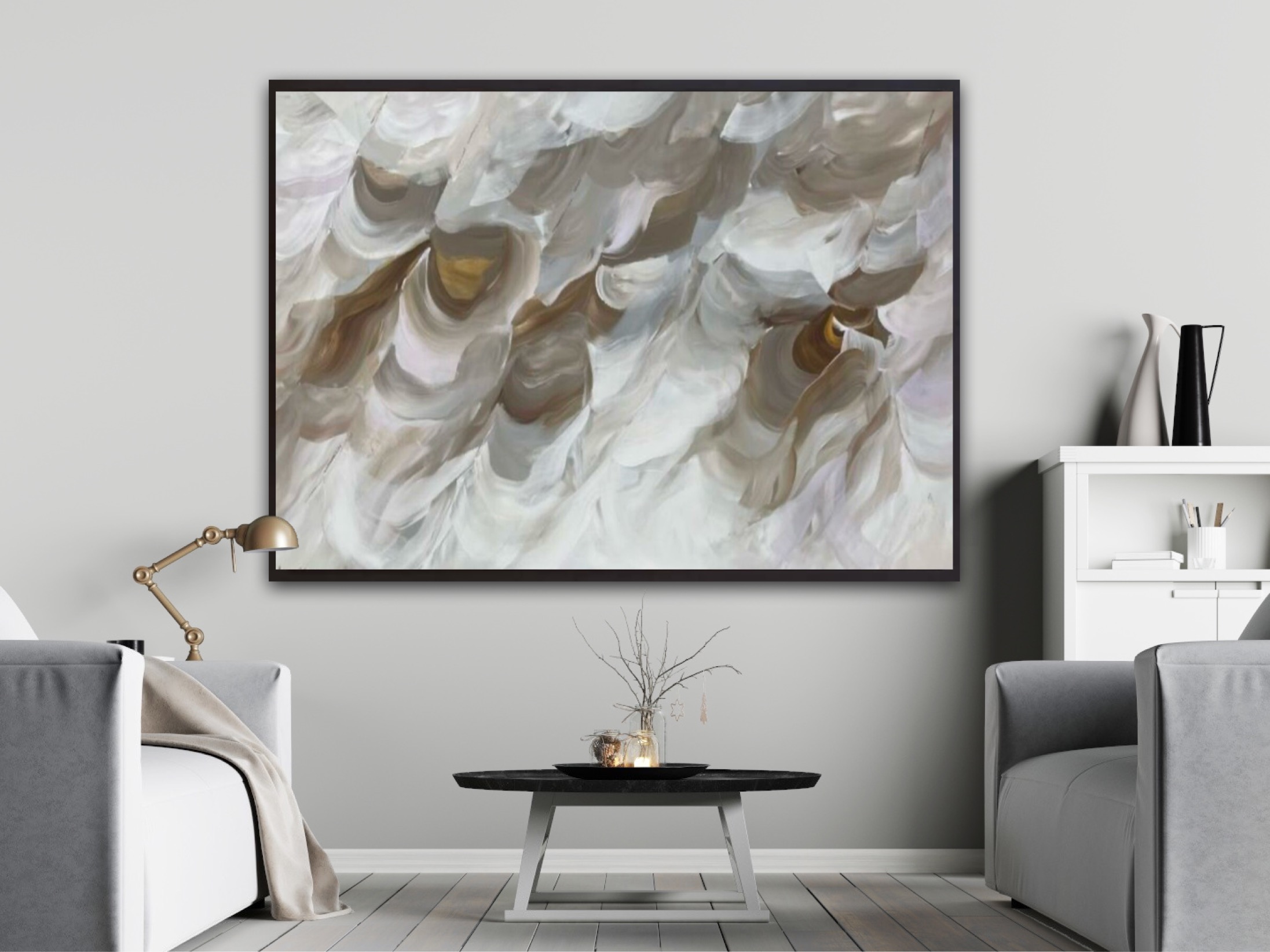 A unique composition that blends a harmonious palette of lilac, brown, and green tones. The combination of these colours creates an intriguing visual experience, evoking a sense of tranquility and nature. Adding a touch of elegance and softness to any space.