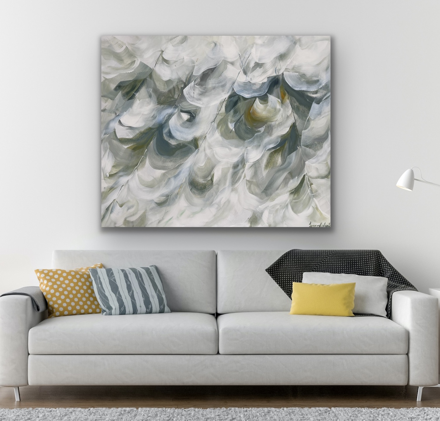 A neutral abstract floral painting that creates a serene and calming atmosphere. The green and blue hues add a touch of nature and vitality. It brings a refreshing and rejuvenating quality to the artwork creating an abstract connection to the natural world.