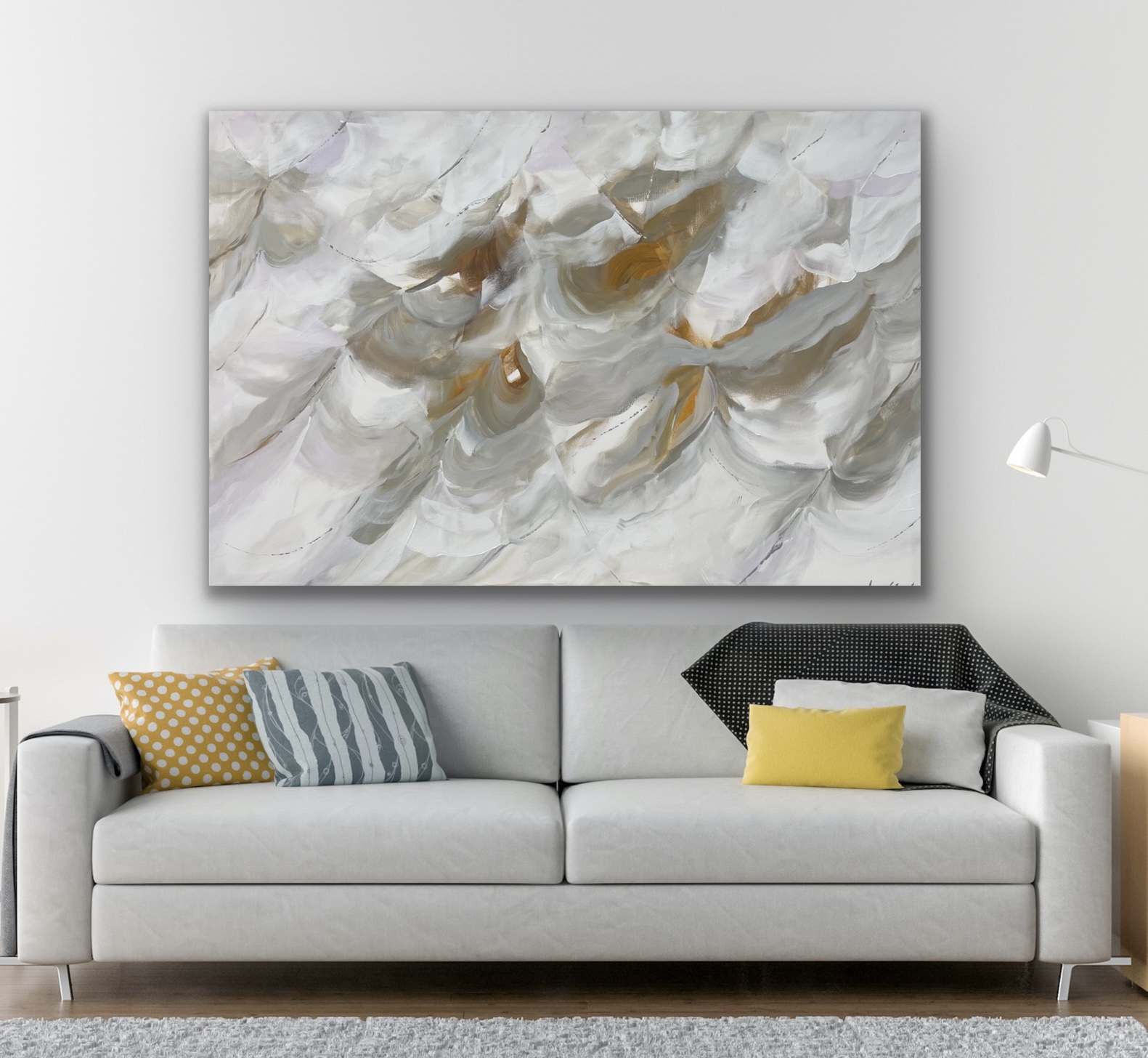 The canvas is dominated by a serene white background, which exudes a sense of purity and tranquility. It evokes a feeling of calmness. Amidst the sea of white, subtle shades of gray gracefully intertwine, forming an array of abstract shapes and lines that seem to dance and interact with one another.