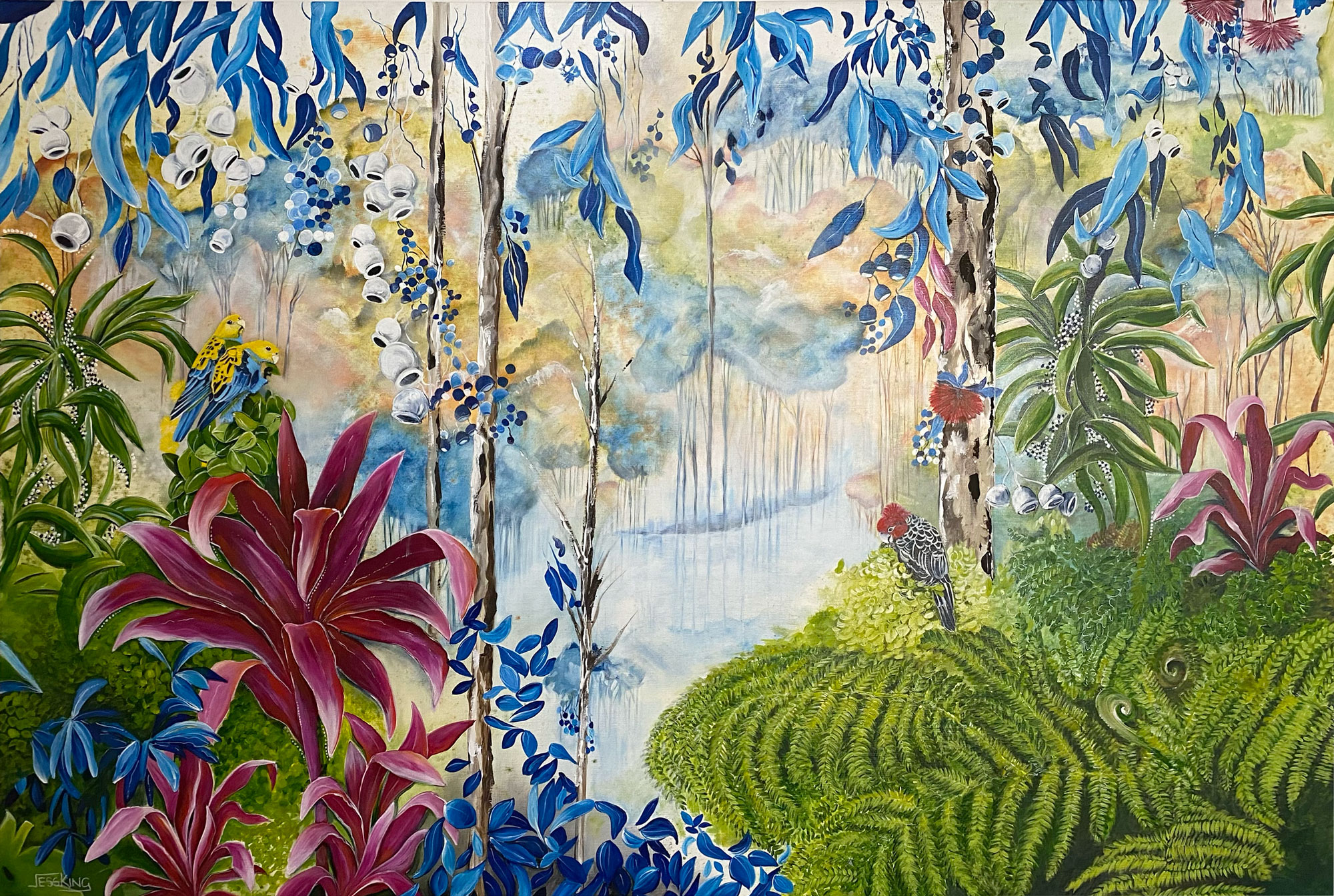Fern and Feathered Friends by Jess King – Walking through the Australian bush is always full of colour and plant life. My rich intense colour palette really captures the essence of Australia in all seasons. If you are hiking, walking or heading to the beach there will always be magnificent nature around to captivate you. My idea is to gather the essence of Australia together in one space for you to be drawn to constantly.