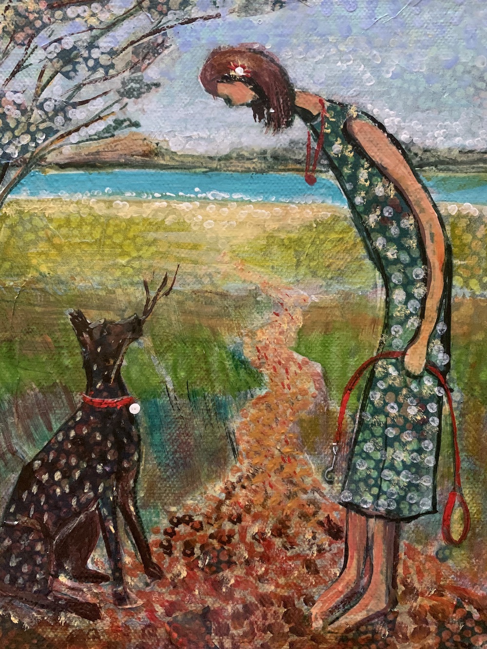 This is a small acrylic/mixed media painting on canvas in a portrait format. The surface was covered in a ‘dotty’ tissue paper before I applied paint, giving the whole a “pointillist’ character.