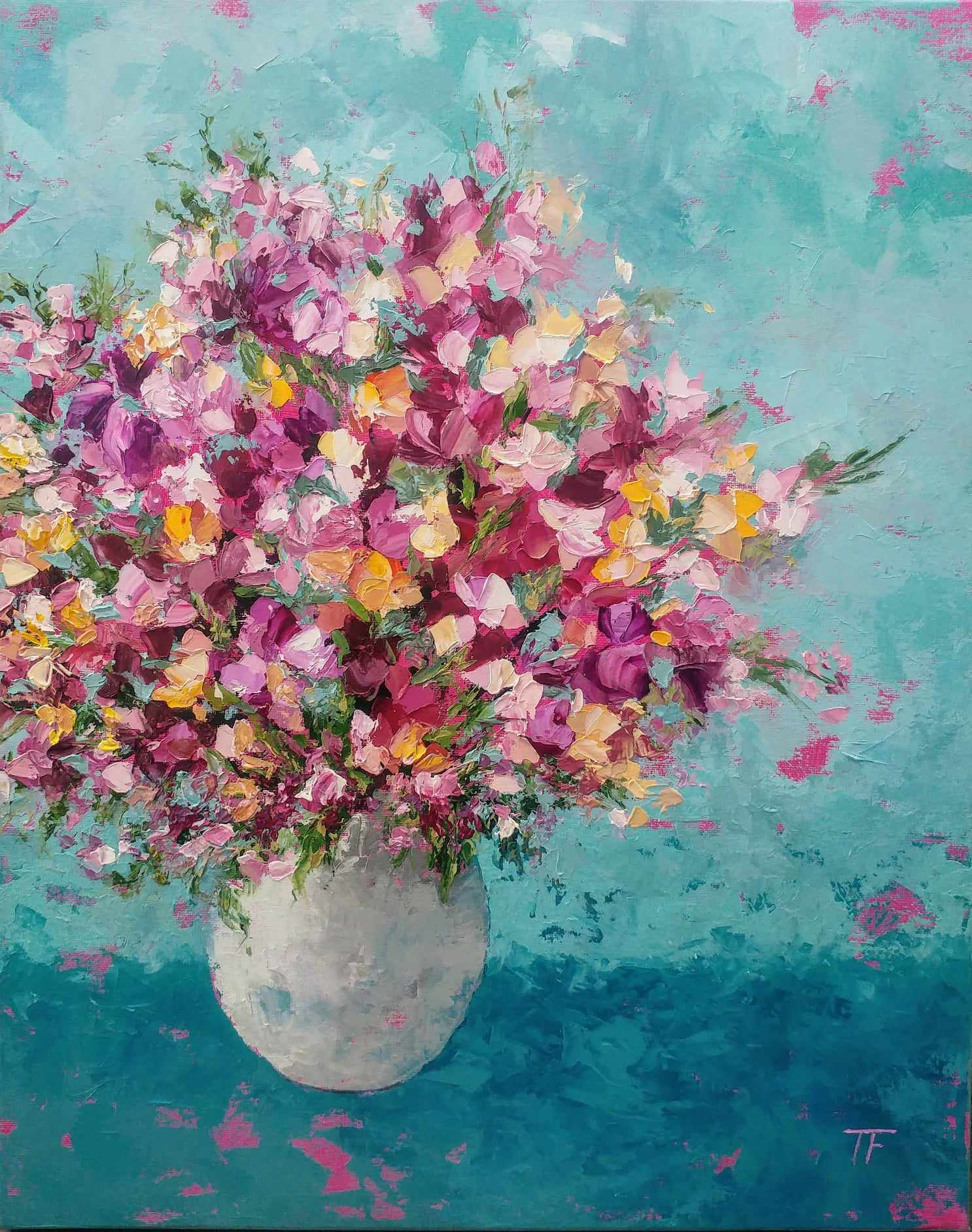 This vibrant impressionist bouquet of flowers is created with a palette knife and thick impasto oil paint, sure to brighten up any space. The intentional shift of the composition’s centre to the left makes it especially suitable for a corner.