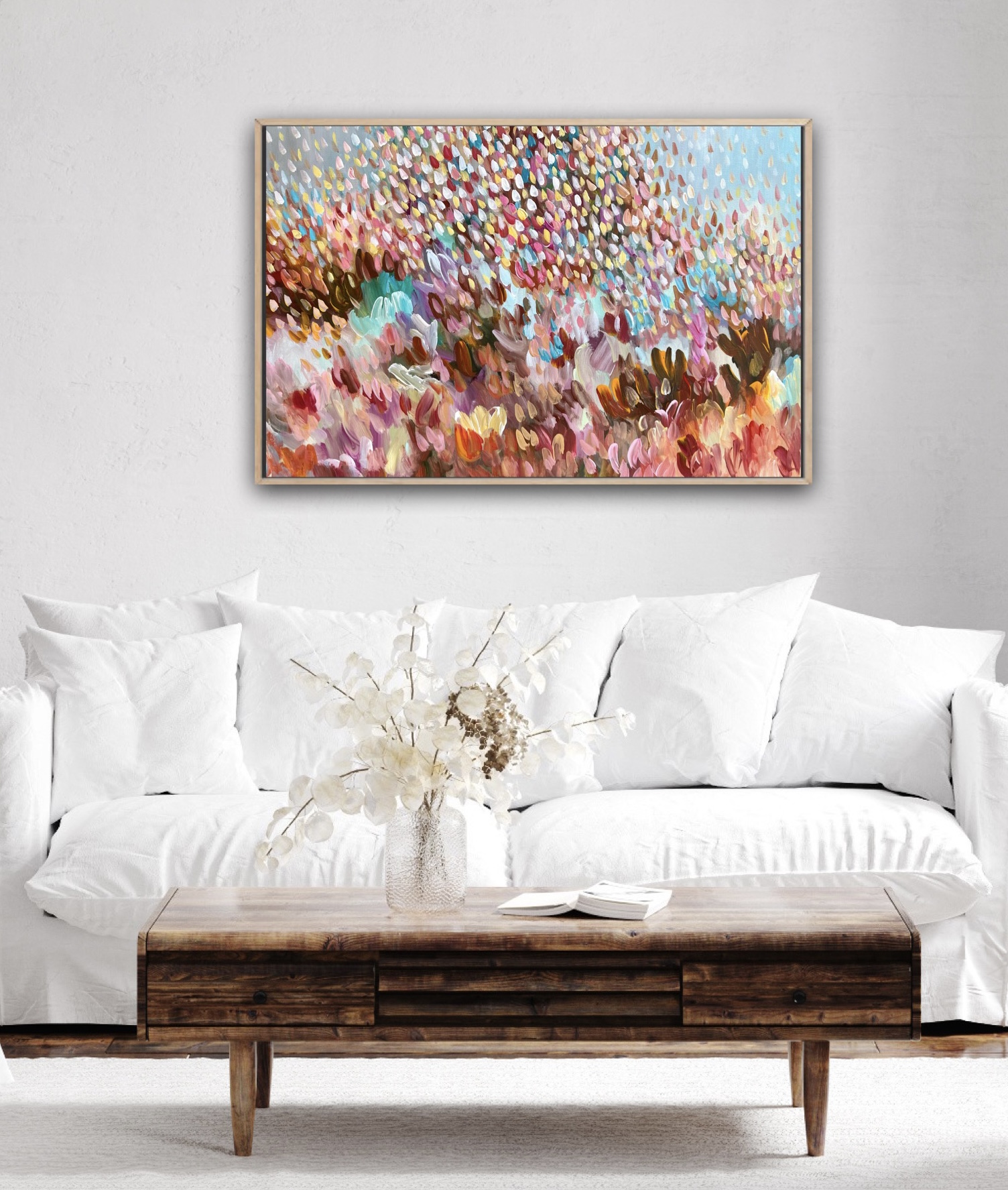 Field of Dreams a painting with beautiful colours of the Field covering the whole landscape painted with lots of expression and freedom to create movement. Capturing the light of the sun falling on to the petals and foliage creating a beautiful bouquet of petals . A composition of colours and rhythms of petals dancing over the landscape swept by the winds . A very peaceful and tranquil painting with so much depth . The painting does not come with an external frame.The painting is signed and dated 2022 at the back and comes with a certificate of Authenticity.