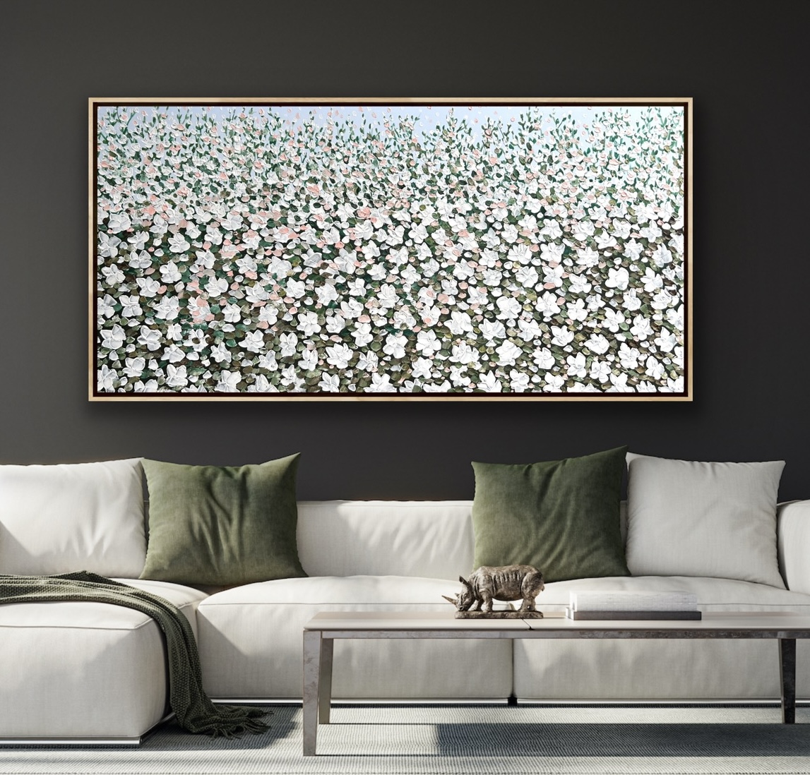 Field of Gardenias by Theo Papathomas a Field of Gardenias a painting with beautiful white colours of gardenias and petals covering the whole field painted with lots of expression and freedom to create movement. Capturing the soft colours of the gardenias and foliage creating a beautiful bouquet of gardenias . A composition of colours and rhythms of petals dancing over the landscape swept by the winds . Painted with a pallet knife to create so much texture with lots of layers of paint . A very peaceful and tranquil painting with so much depth . The painting does not come with an external frame.The painting is signed and dated at the back and comes with a certificate of Authenticity.
