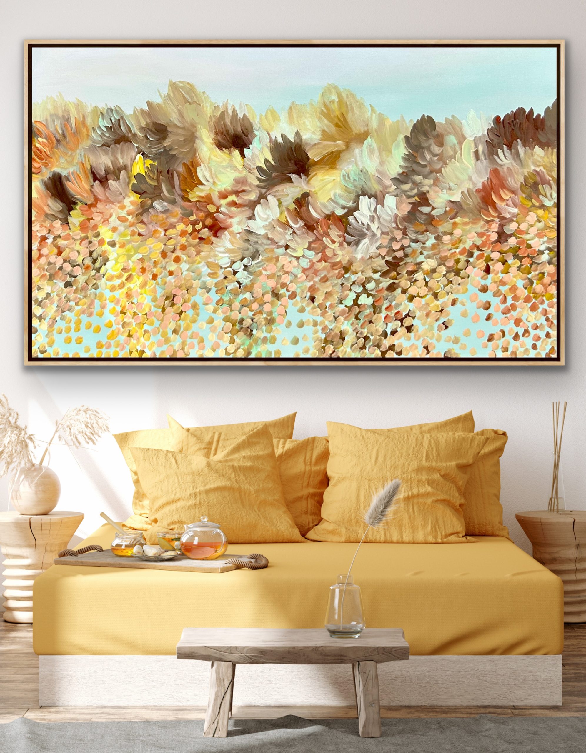 In this acrylic piece, I poured my heart into capturing the gentle dance of light and petals, blending abstract and impressionist touches. Every brushstroke breathes warmth and tender energy, inviting calm and joy. Imagine this blossoming vibrancy elevating your space, filling it with serene beauty and soft whispers of nature’s endless bloom. This painting does not come with an external frame.The painting is signed and dated at the back and comes with a certificate of Authenticity.