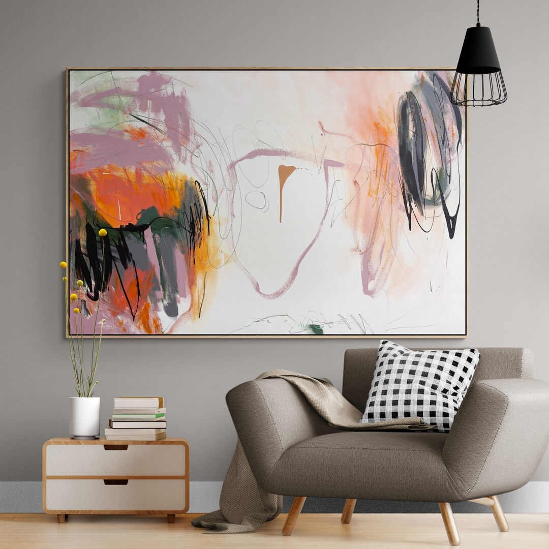 It’s a fun uplifting piece. It’s intriguing mark making combined with its striking palette of beautiful soft apricot, blush and pinks, sage green and orange, mixed with white and neutral tones all dancing around bold black, green and grey line work.
