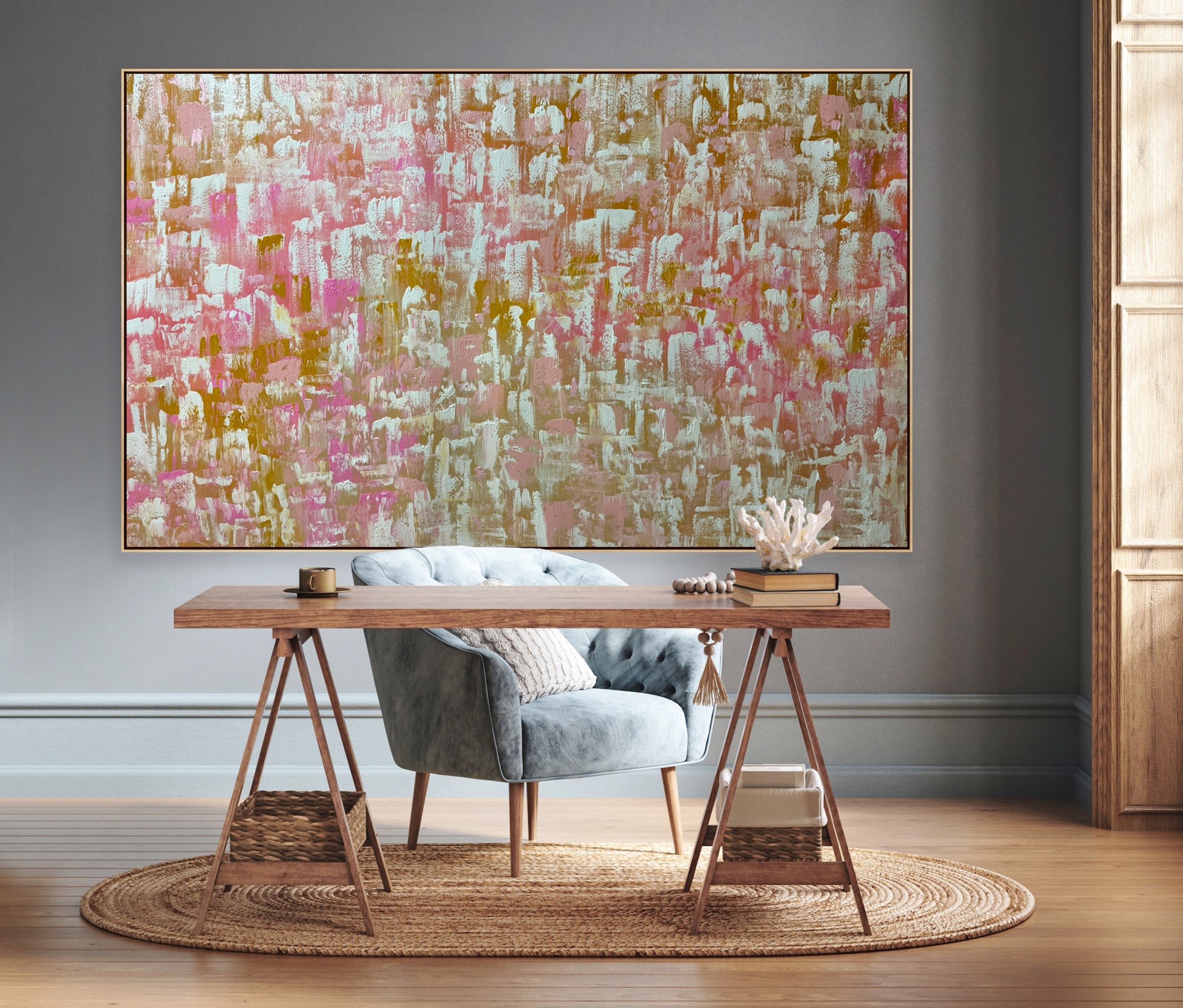 Like walking barefoot along a quiet shoreline, this textured abstract painting invites you to slow down and savour the gentle discoveries waiting beneath the surface. Soft pinks, sandy neutrals and coral-inspired marks echo the delicate fragments of shell and stone hidden within warm beach sands. Each brushstroke is a reminder that beauty often reveals itself when we stop hurrying and begin noticing. Let this piece ground our space in calm, joyful presence.