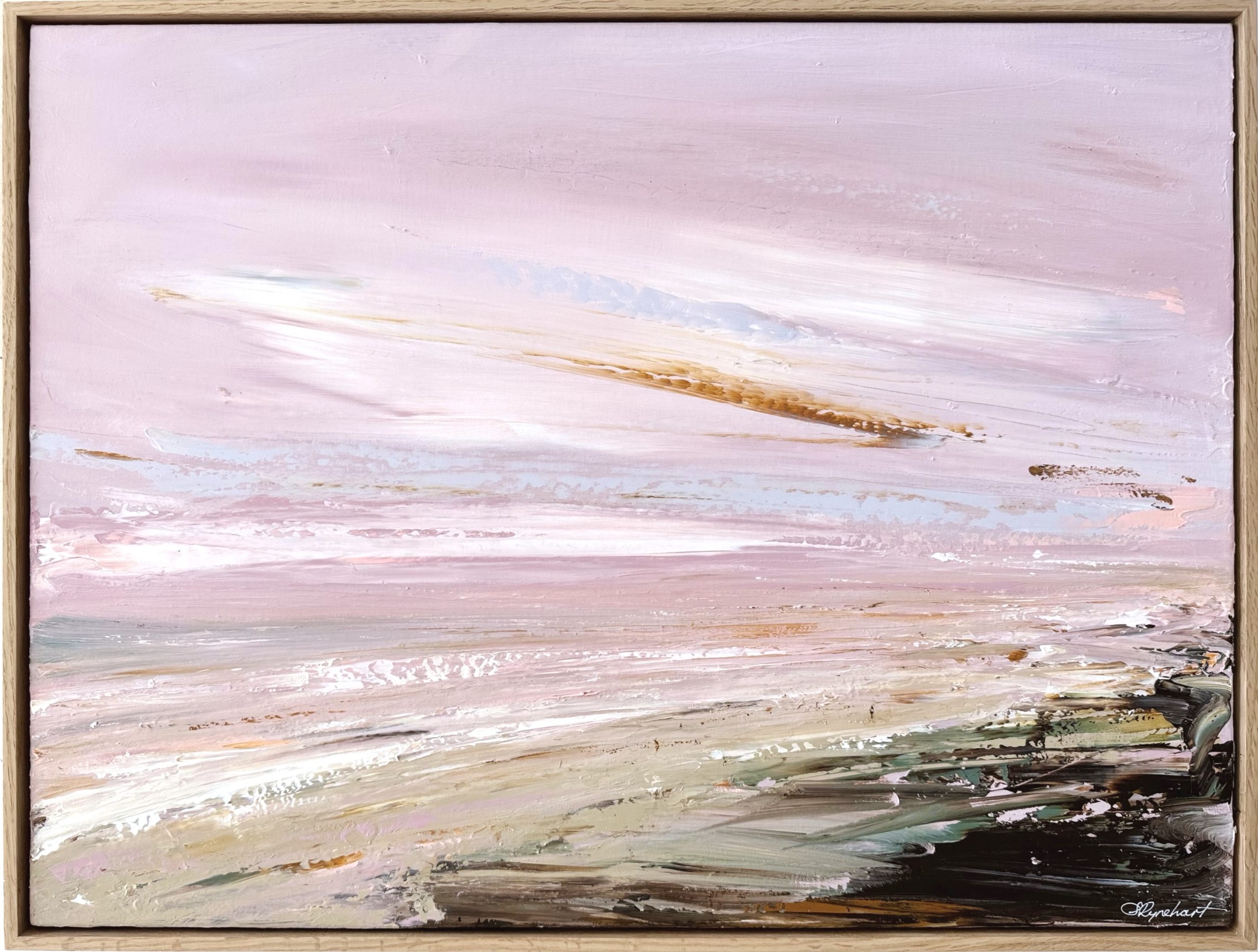 Created with palette knives, this emotive beachscape with the smallest tiny figure on the sand, reflecting on all the above, is framed in a solid oak timber frame, It has been satin varnished and comes with a COA.