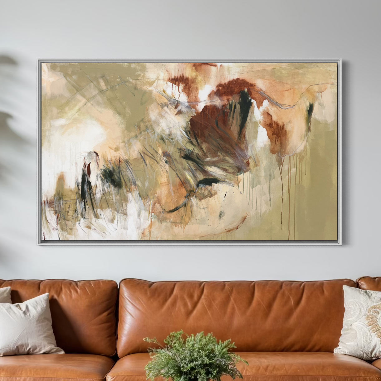 The intuitive mark making and the warm palette of ochre, tan, peach pink and brown earthy tones combined with white and contrasting olive, sage, fawn and dark greens combined with line work in grey, black and orange which link the areas of negative space together.