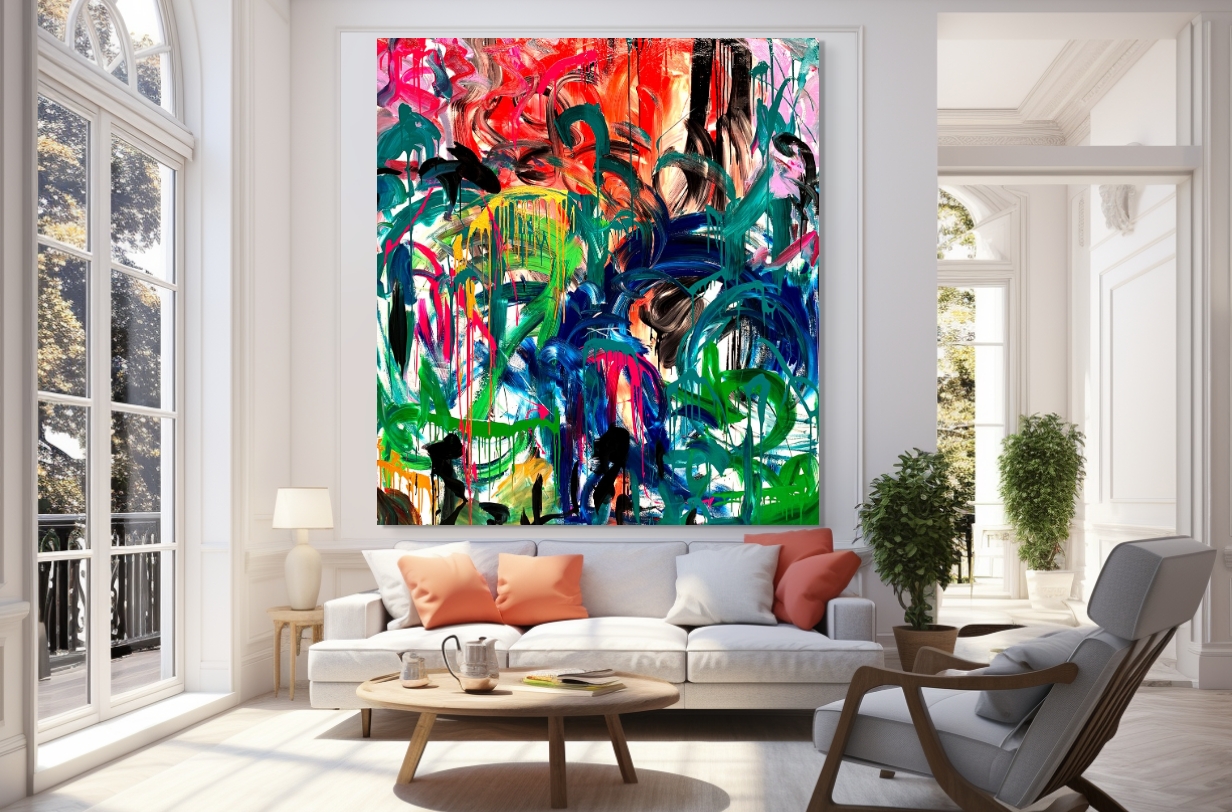This work is painted on professional-grade canvas and has been sealed with varnish. The canvas is 1160 cm in width by 176 cm in height. The painting is larger than this to allow for a colour wrap, so that the sides are painted in the same manner as the surface. Therefore no frame is required.