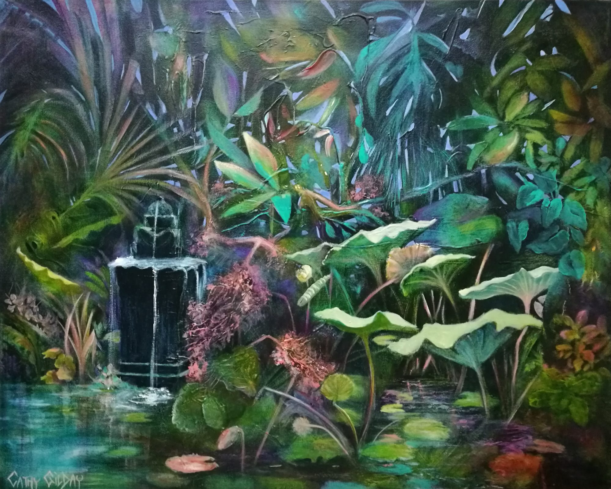 Can there be anything more relaxing and peaceful than the gentle sound of water trickling? Combine that image with the gorgeous lush colours of tropical foliage and you have a painting that will take you there.