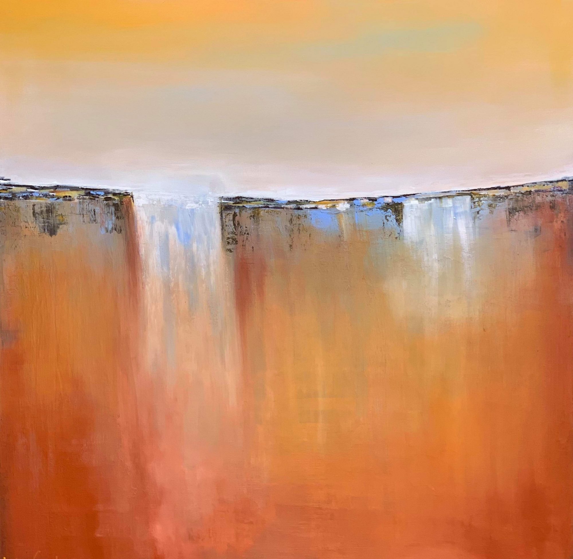 Sunshine and rain – two contrasting elements but both equally essential. Part of my waterfall series, this painting takes me back to the Yinnar bushfires of 2018. Due to its close proximity, and the fact that we knew people who lived in the affected is painting depicts the fearesome oranges and reds of the savage fires. The water is what was so desperately needed to save property and livestock. Fortunately our friends homes were spared but others lost everything. Although the colour and vibrant and quite vivid, in this instance it depicts how certain elements can affect our land.