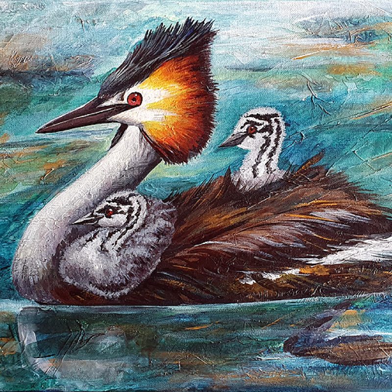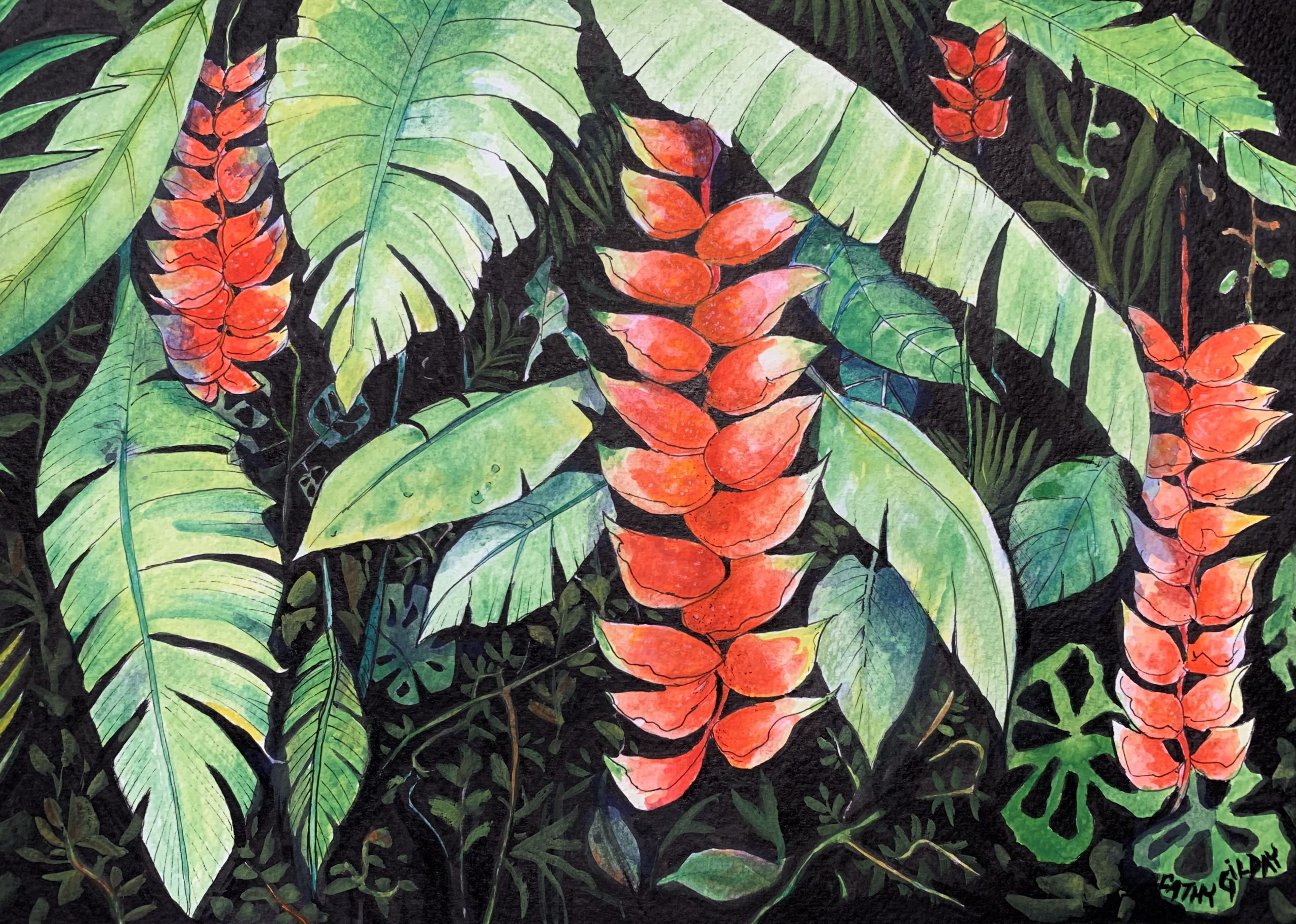 Firecracker Red by Cathy Gilday – This painting was inspired by my holiday in Bali, where lush tropical gardens and spectacularly colourful flowers are everywhere you look. I particularly love this pendulum like flower that seems to grow like a weed, yet adds beauty to the island.