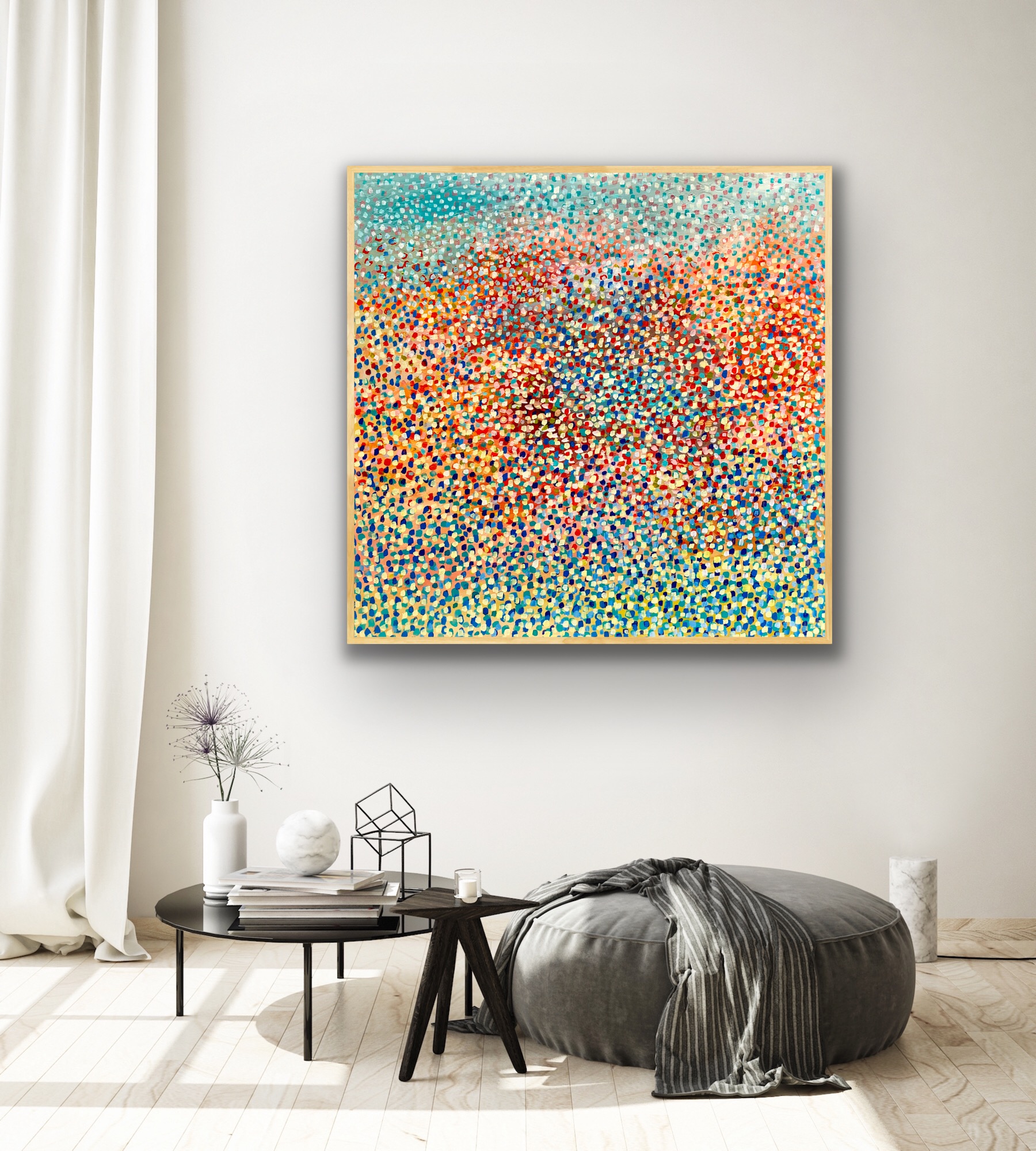 Fireworks of Confetti  – This artwork was inspired by confetti falling on the landscape creating a feeling of fireworks . I wanted to capture the richness of colour and the beautiful rhythms of the confetti falling on the land. Hope with this s work it makes the viewer feel very peaceful and tranquil. This painting is framed with a natural pine frame signed and dated at the back of the painting and comes with a certificate of Authenticity.