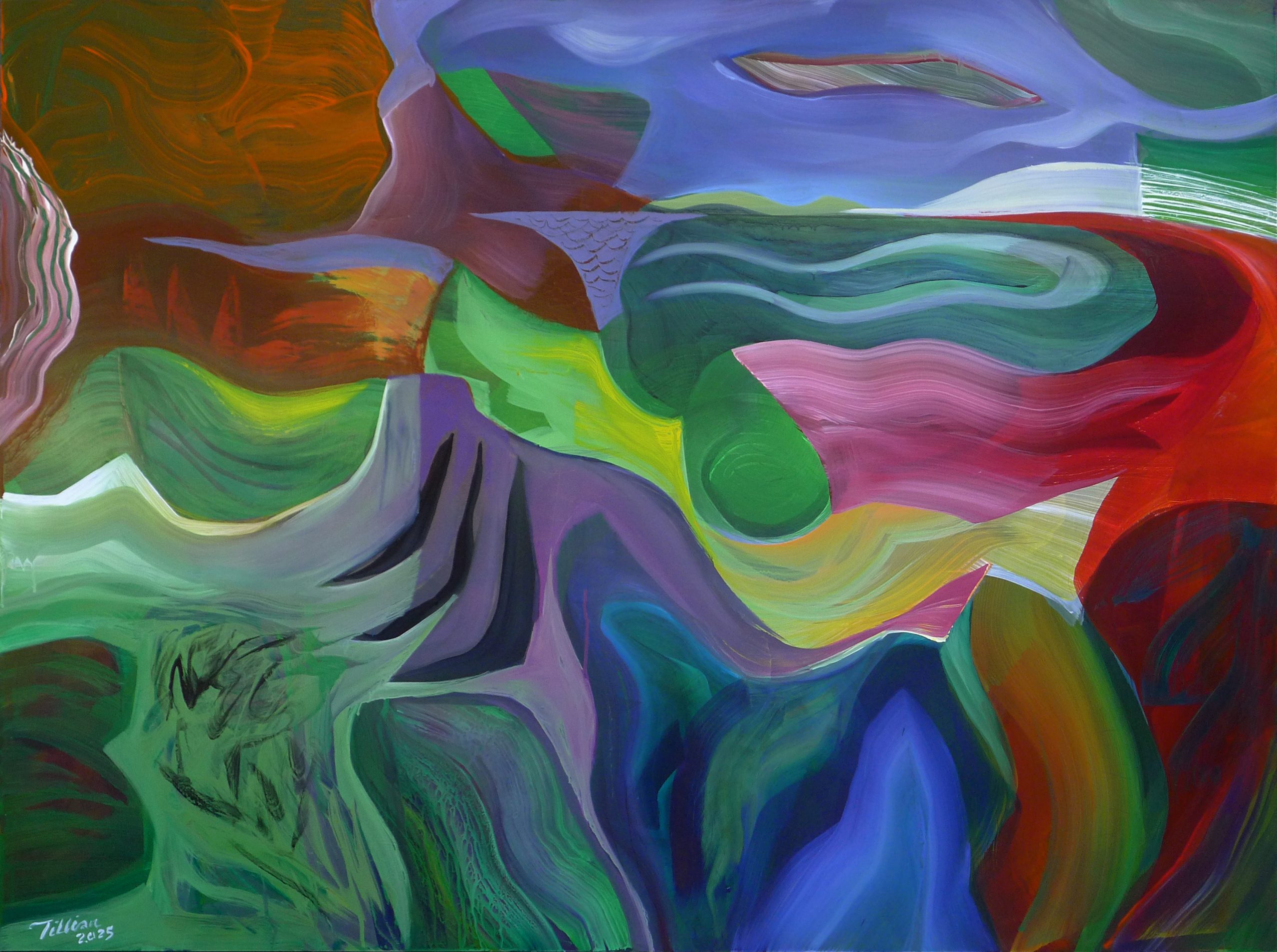 ‘First Contact’ (2025) is an undulating, chromatic encounter between worlds, sensibilities, and systems of understanding. Rendered in large format with lush, fluid brushstrokes, the painting enacts a confrontation not between peoples per se, but between ‘storying systems’ or the geometries of culture. The land appears to be remembering and responding, morphing and dreaming.