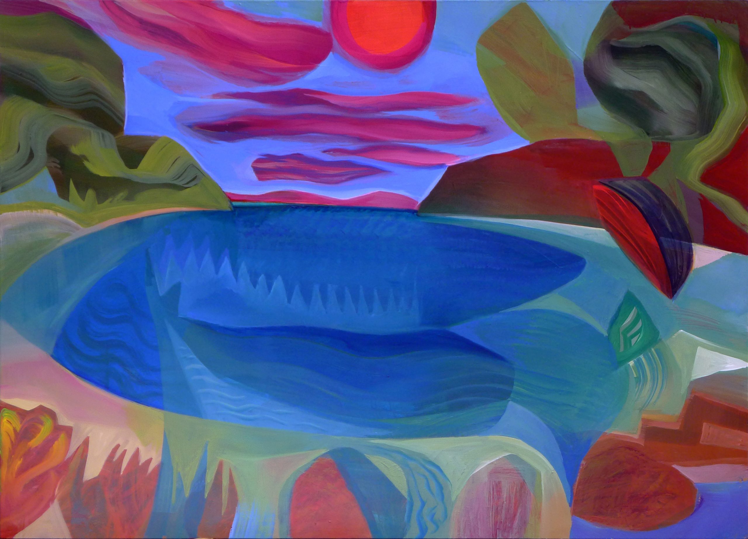 “First Day of the Christian Sun” confronts the foundational mythos of colonisation in Australia—the moment when imperial vision declared an ancient continent ‘empty’ and bathed it in the moral and optical clarity of a ‘Christian’ sun. Visually lush yet ideologically harrowing, the work stages a struggle between submerged memory and imposed narrative. The whale beneath the bay, lips across the sky, and dragon-shaped headland suggest Indigenous memory, language, and power suppressed beneath the rising glare of the “Christian sun.” A dreamscape charged with symbolic force, this painting reflects on the colonial arrival in Australia as both a literal and metaphysical dawn.