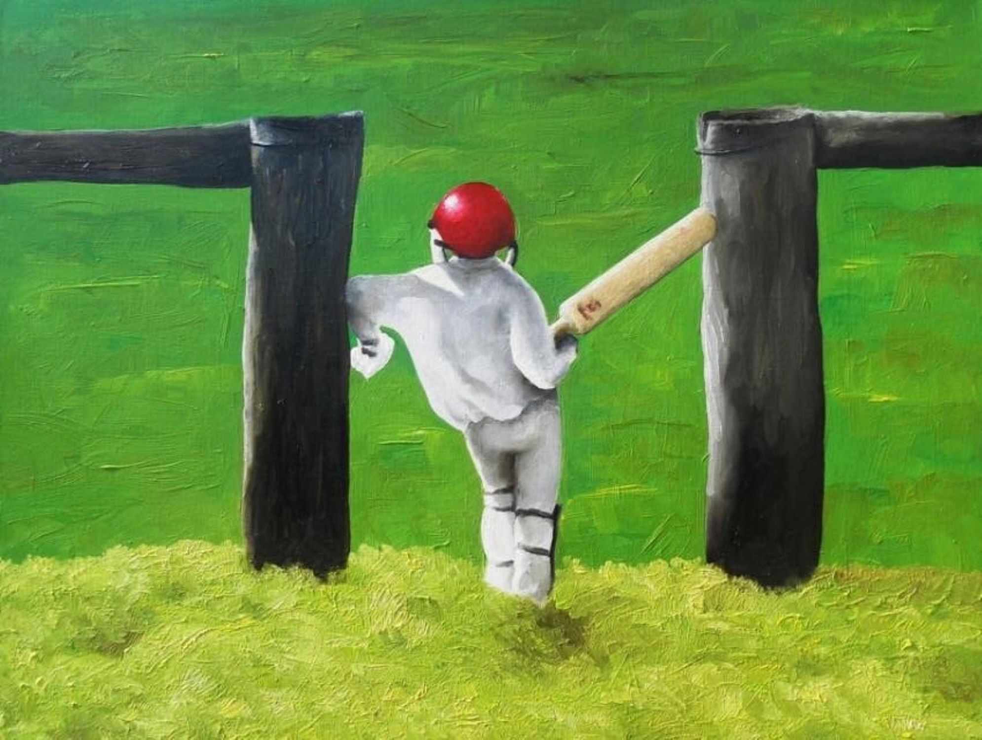 A departure from my usual subject, but bearing my trademark pop of colour, this piece was inspired by my son’s cricket playing days. This is not actually him but a teammate who was a couple of years younger than the other boys and just a tad shorter – those fence posts were only about a metre or so tall 🙂 As I recall, this didn’t deter him at all and he’s seen here nonchalantly awaiting his turn to bat.