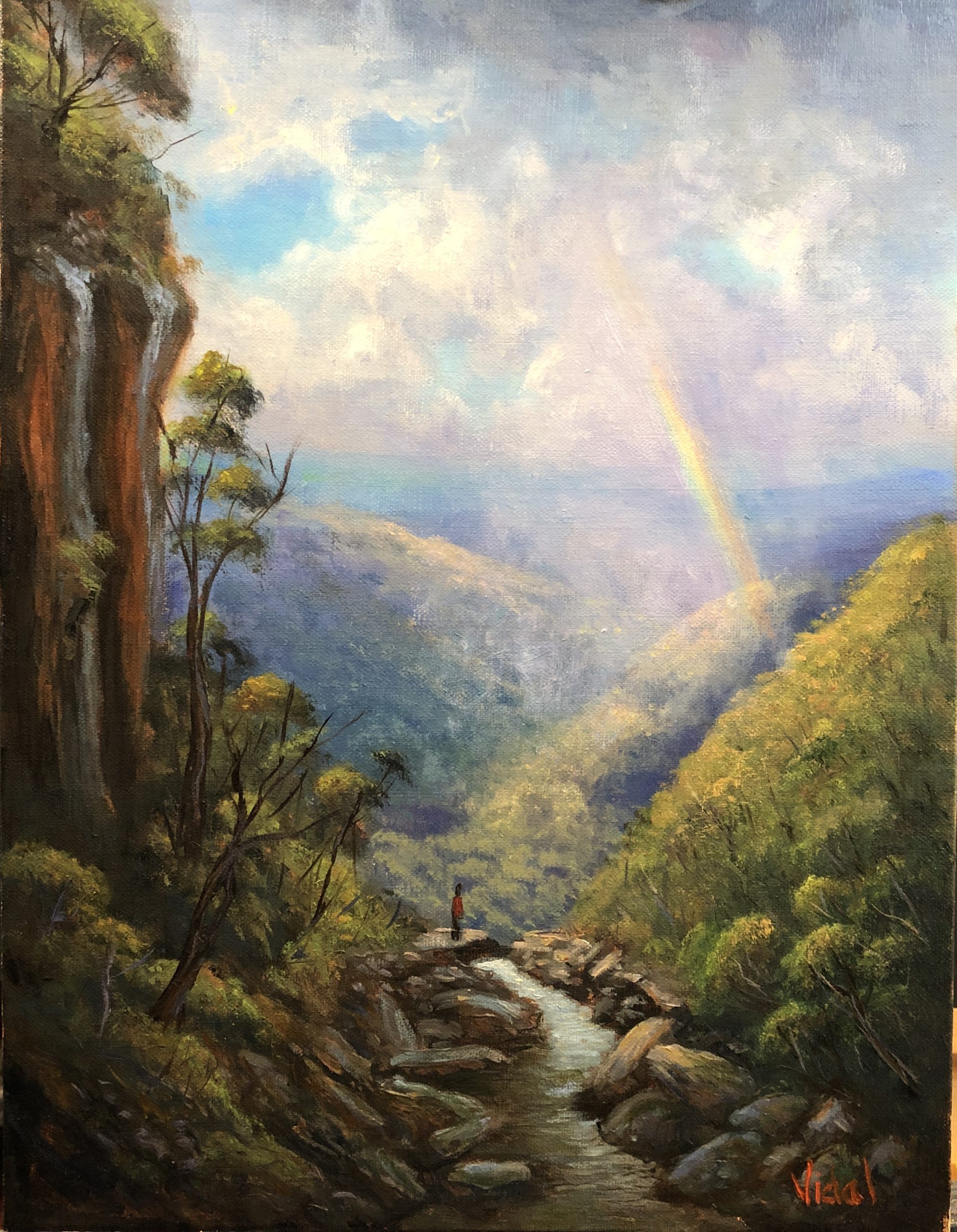 The beauty of the effects on light on water vapour – the rainbow. The rainbow is a sign of hope, the beauty after the storm. In this painting I created a foreground that is typical of the Hudson River School artists with rocks, water and human figure.
