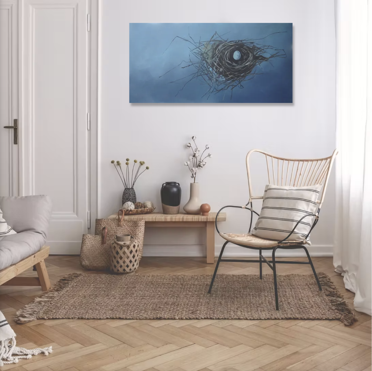 A single egg rests in the cradle of a nest — untouched, yet full of promise. First Light speaks to the moment before becoming, the hush before creation stirs. As a symbol this reminds us of the power held in focused desire — that all beginnings, no matter how small or fragile, carry the blueprint of something profound. This is the soul’s quiet yes to life, a whispered intention waiting to hatch. (Shown with another painting from my series in one shot, but this is just a pairing suggestion)