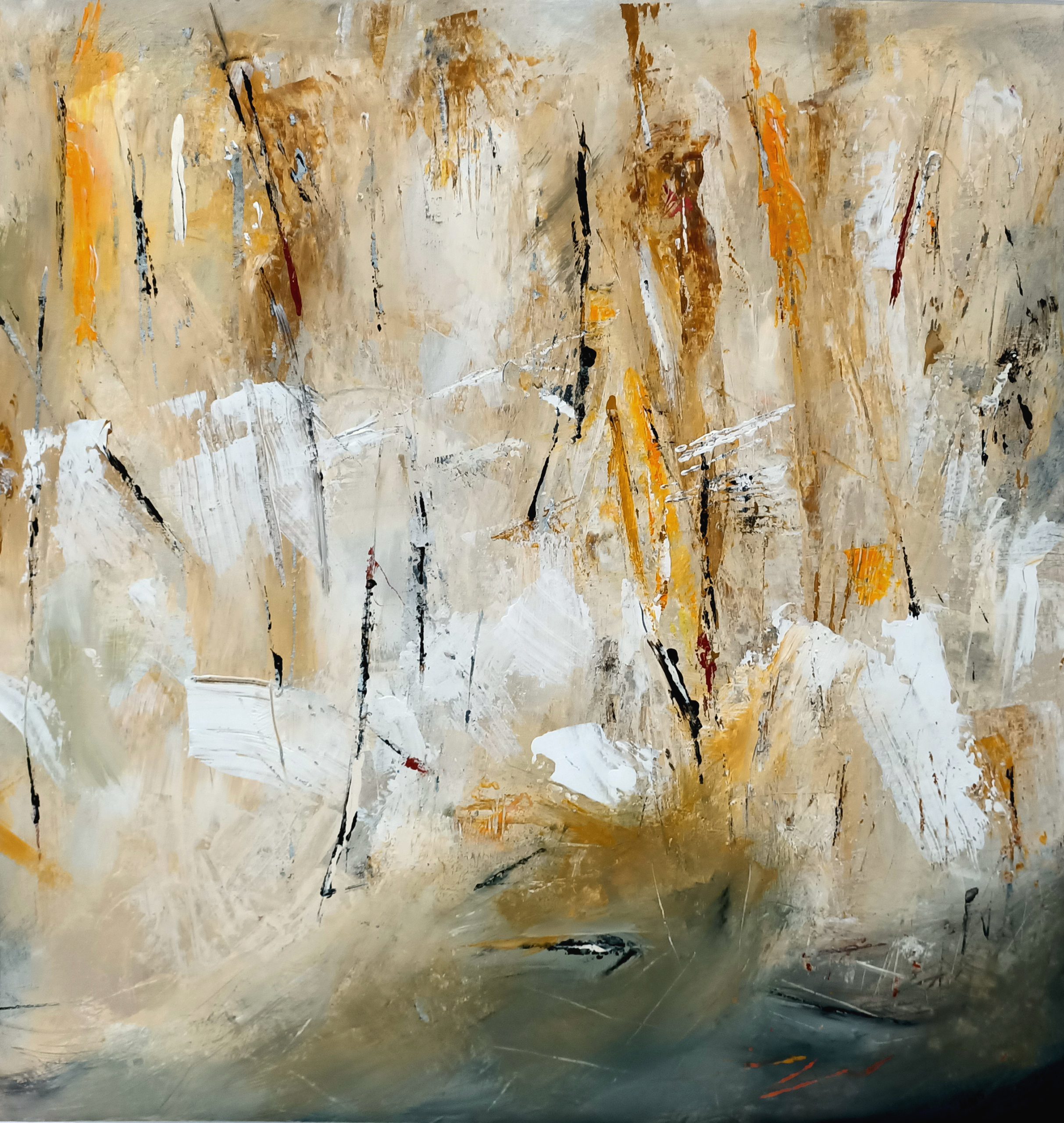 This abstract piece is rich in colour and contrast and depicts the first dusting of winter snow on the rugged landscape.