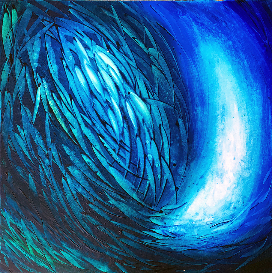 A bait ball, or baitball, occurs when small fish swarm in a tightly packed spherical formation about a common centre. It is a last-ditch defensive measure adopted by small schooling fish when they are threatened by predators. … Sardine bait balls can be 10–20 metres in diameter and extend to a depth of 10 metres. This, is my version of a bait ball, painted in deep, rich, thick oils.