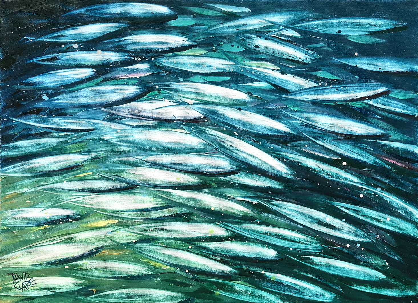 Fish School Mini 11 by David Clare – Original abstract painting of a colourful school of fish. I have always been inspired by the beautiful colours of the ocean, and the mesmerising movement of schools of fish. I have painted them many times, and have always felt the the bigger the painting the better, creating more depth. But I have since decided to paint some small versions, and with a smaller brush I can create the same depth as the larger paintings. The bonus with these small paintings is that I can frame them because they are easy to handle. They are perfect for an office, or small area, and also more affordable than the large paintings. This is one of many in this new “mini” series.