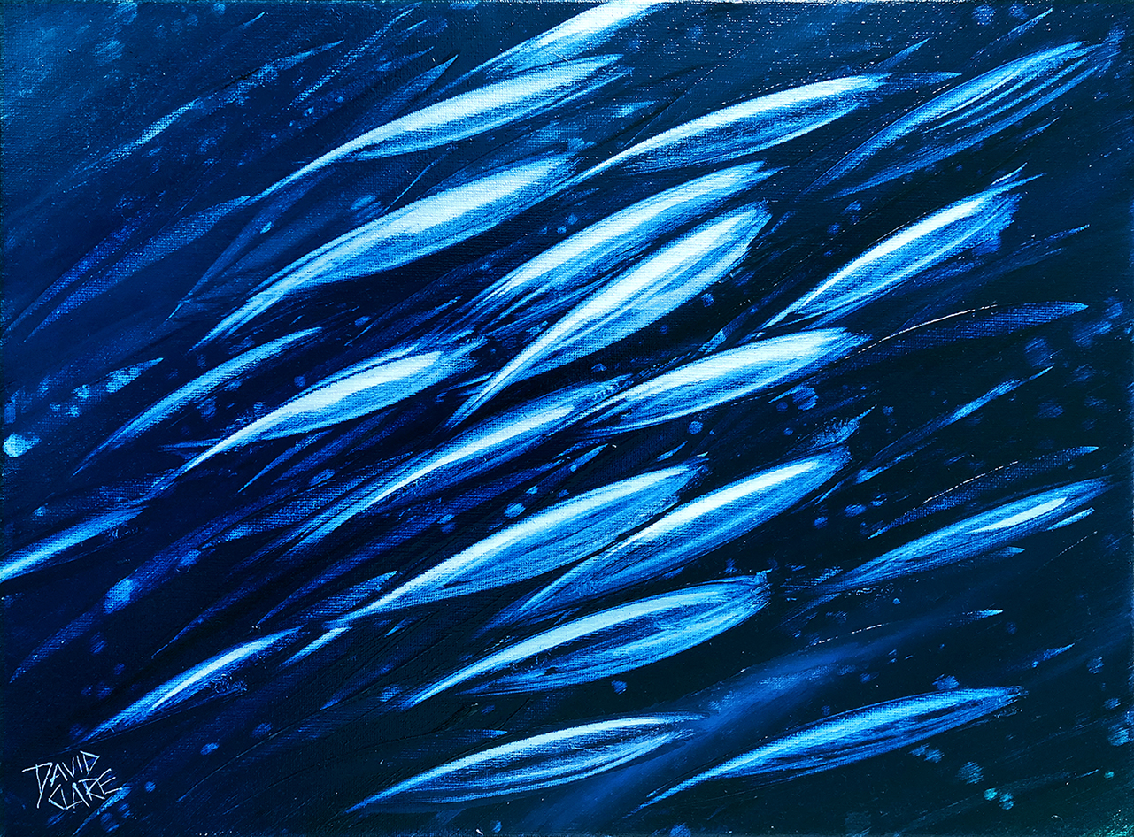 Fish School Mini 4 by David Clare – Original abstract painting of a colourful school of fish. I have always been inspired by the beautiful colours of the ocean, and the mesmerising movement of schools of fish. I have painted them many times, and have always felt the the bigger the painting the better, creating more depth. But I have since decided to paint some small versions, and with a smaller brush I can create the same depth as the larger paintings. The bonus with these small paintings is that I can frame them because they are easy to handle. They are perfect for an office, or small area, and also more affordable than the large paintings. This is one of many in this new “mini” series. Ideal Christmas presents!