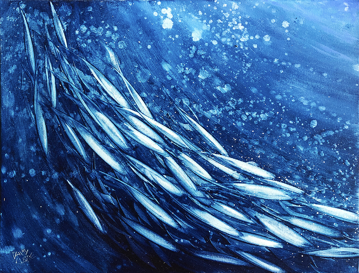 Fish School Mini 6 by David Clare – Original abstract painting of a colourful school of fish. I have always been inspired by the beautiful colours of the ocean, and the mesmerising movement of schools of fish. I have painted them many times, and have always felt the the bigger the painting the better, creating more depth. But I have since decided to paint some small versions, and with a smaller brush I can create the same depth as the larger paintings. The bonus with these small paintings is that I can frame them because they are easy to handle. They are perfect for an office, or small area, and also more affordable than the large paintings. This is one of many in this new “mini” series. Ideal Christmas presents!