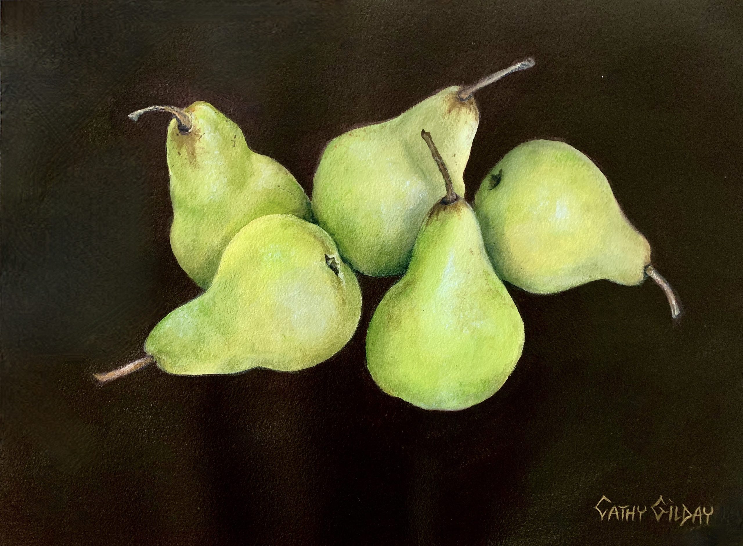 Five Pears, Still Green by Cathy Gilday -This  still life painting was inspired by the fact that we recently did our first on-line supermarket shop, due to isolation. These five pears, arrived so firm and green, they almost appeared artificial. Each day I walk past the fruit bowl, give them a little squeeze and mutter, “still green.” I eventually came to the conclusion that they may never ripen but decided they would be a great reference for a still life, hence the title.