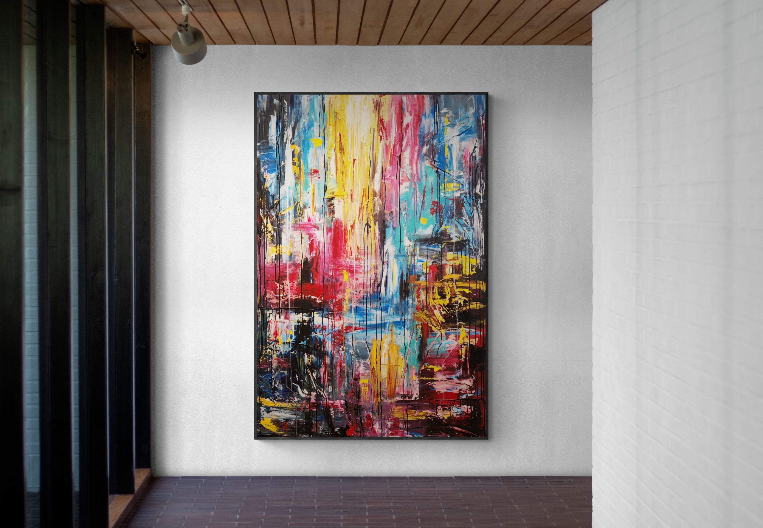 This beautiful modern piece is made with lots of layers and drips of acrylic paint. It was varnished for a protection of color. It has a wire at the back and is ready to hang. Signed with a certificate of authenticity. Unframed.