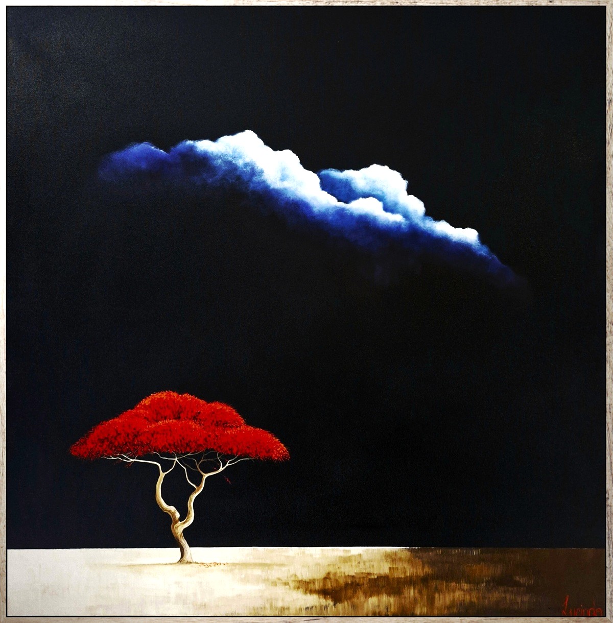 This striking 100 cm x 100 cm painting, set in an elegant oak floating frame, captures the haunting beauty of the African savanna at night. At the heart of the composition stands a solitary acacia tree, its vibrant red foliage glowing like embers against the deep, quiet tones of the evening. The vast, sun-bleached grasslands stretch endlessly behind it, evoking a sense of both stillness and expanse. The piece contrasts the intense warmth of the tree with the cool calm of the night, creating a dreamlike atmosphere that is both bold and serene. It’s a powerful tribute to the raw, untamed soul of the African wilderness.
