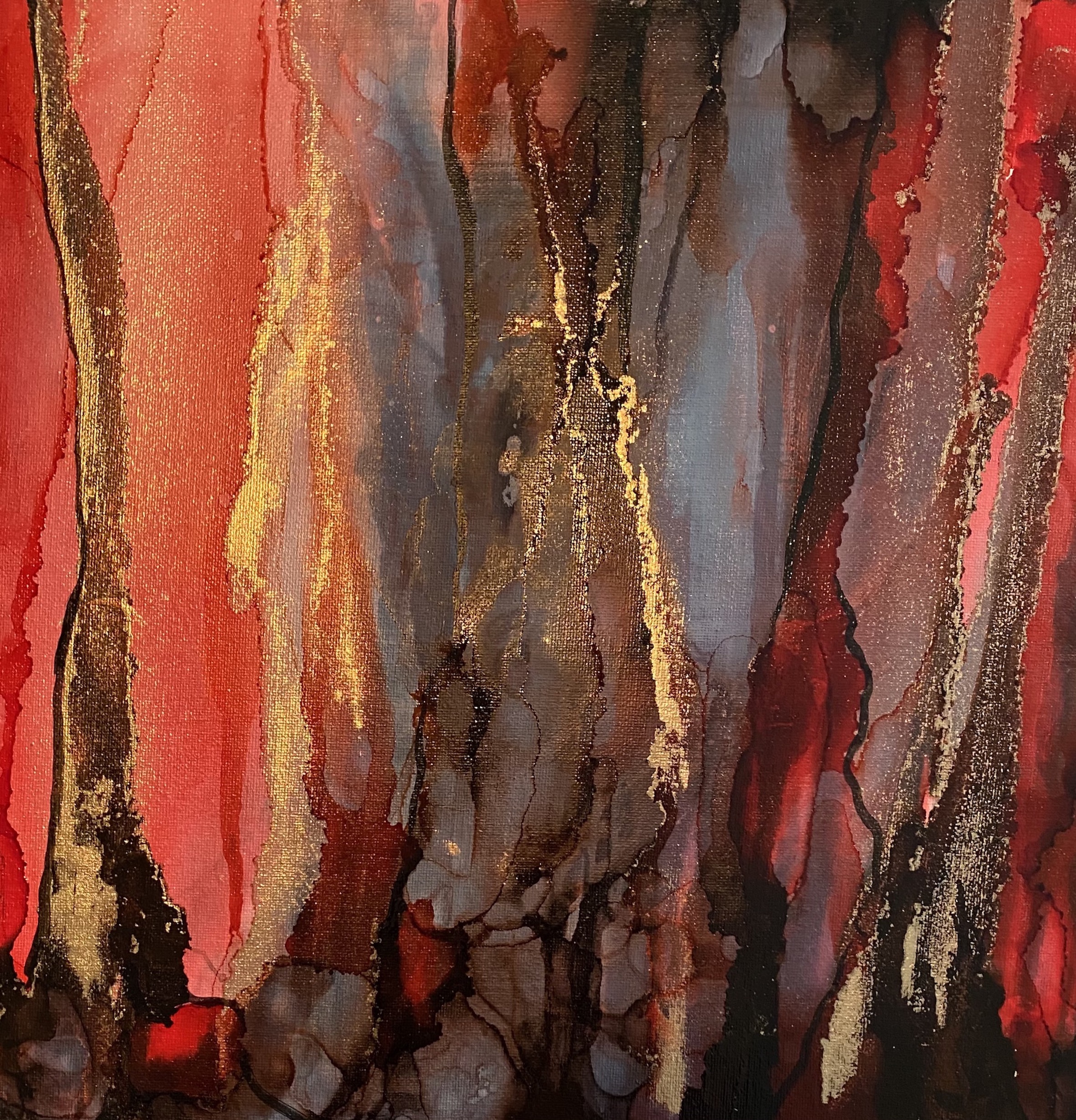 “Flaming Sunset” is painted in the abstract expressive genre. Vivid, original contemporary Australian Landscape  small painting depicting my lively, colourful interpretation of the glorious sunsets I see where the crimson hues permeate the forest of  tall trees next to my art studio.  A wonder to behold!  This painting has been created with alcohol inks, chosen for the intensity of their colours, painted onto a stretched canvas.  It has gallery d-rings on the rear and cord, ready to adorn your wall.  It measures 36cm x 36cm x 2cm.  The edges of the painting have been finished in black to provide a smart contemporary finish.  The painting will be delivered with my Artist Certificate of Authenticity.