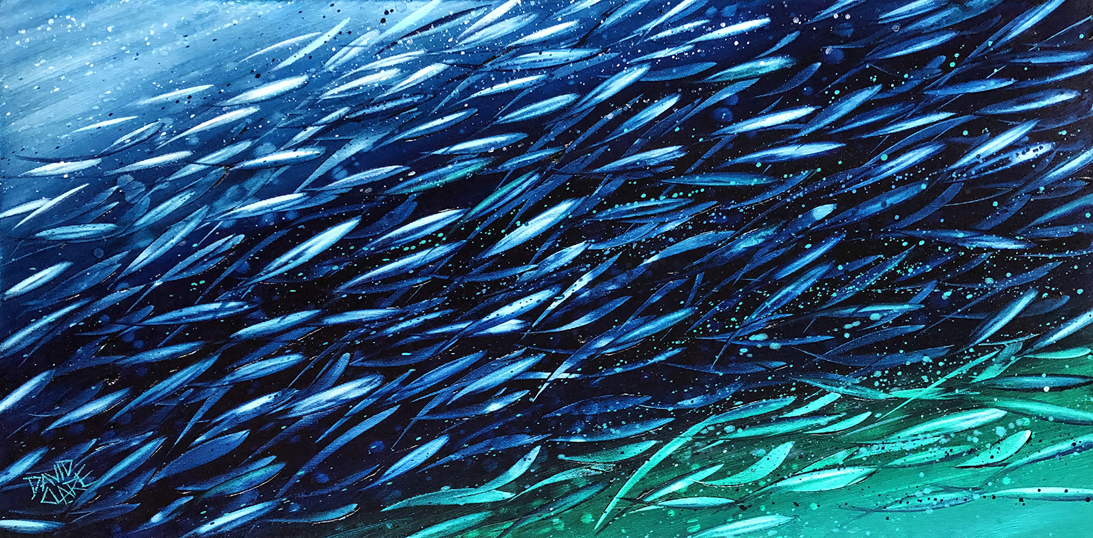 Fleeting Fish 2 by David Clare – Original abstract painting of a colourful school of fish. I am endlessly inspired by underwater scenes, especially schools of fish. Their shimmering movement, and the beautiful colours of the ocean are irresistible.