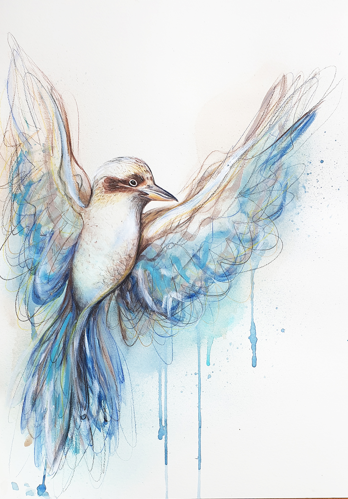 Flight of the Blue Winged Kookaburra by Leni Kae – An Australian favourite – the blue winged kookaburra. Carrying symbolism of prosperity and embracing the power of family and laughter for healing and creating joy . Created on A2 300gsm size paper using pencil, watercolour and acrylic paint. Tones of browns and blues. Perfect for art collectors or as a unique gift for bird lovers.