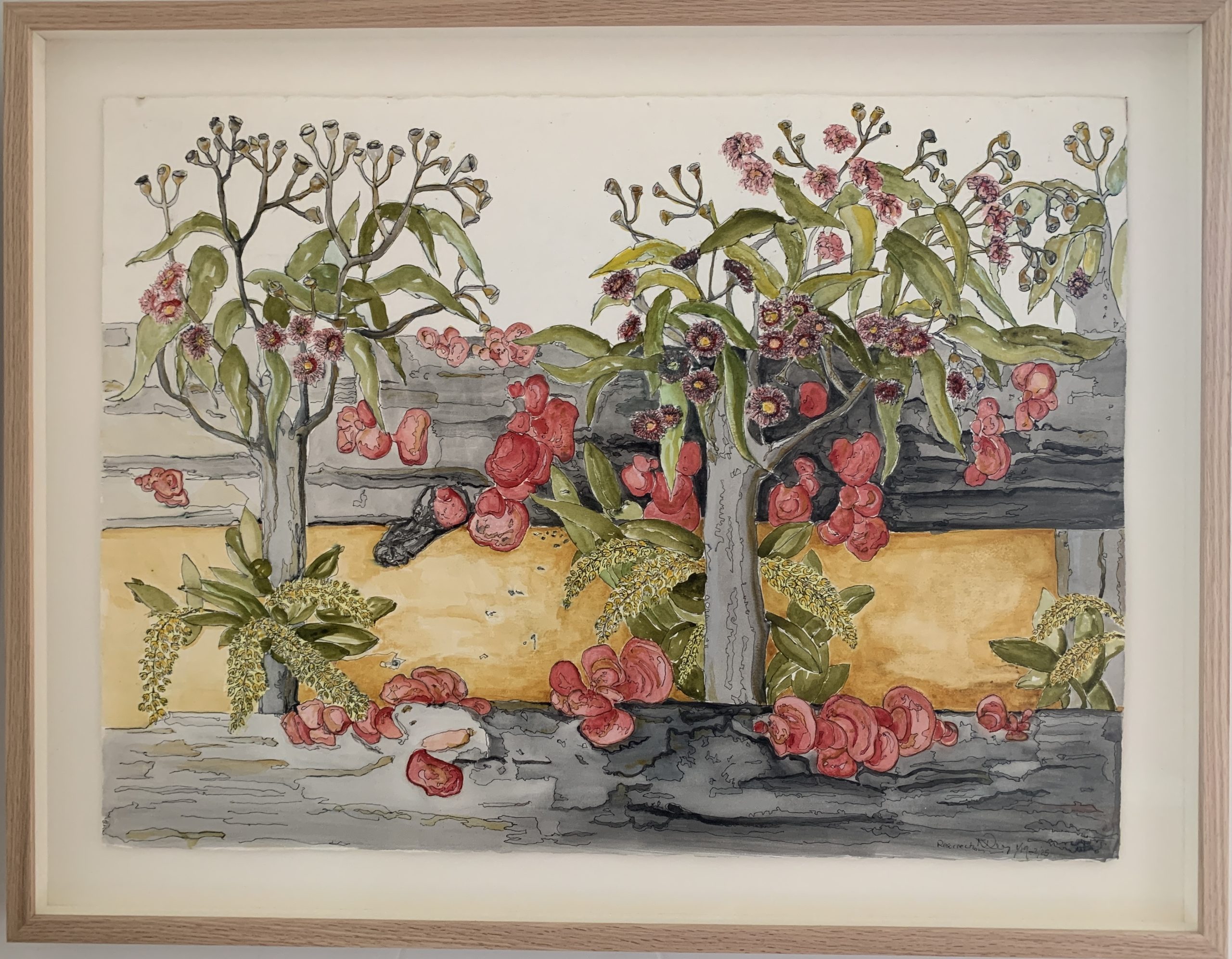 Resurrection by Kim Rees – Â Representational of renewal in the cycles of the seasons and all they endure, fires, storms, drought and more, the resilience and wonder of nature as it adapts. Drendrobium speciosum orchids, native to Australia (epiphytic) are one of the most spectacular of the species when in full bloom combine, with an interest in the many varieties and colours of fungus that can appear literally overnight, and of course gum nuts and gum trees, so iconically Australian, come together in this watercolour and pen artwork on Arches deckled edge 300gsm paper. Â Framed,- float frame with non reflective glass. Ready to hang. Shipped with a certificate of authenticity. Insitu’s are intended as a guide only.