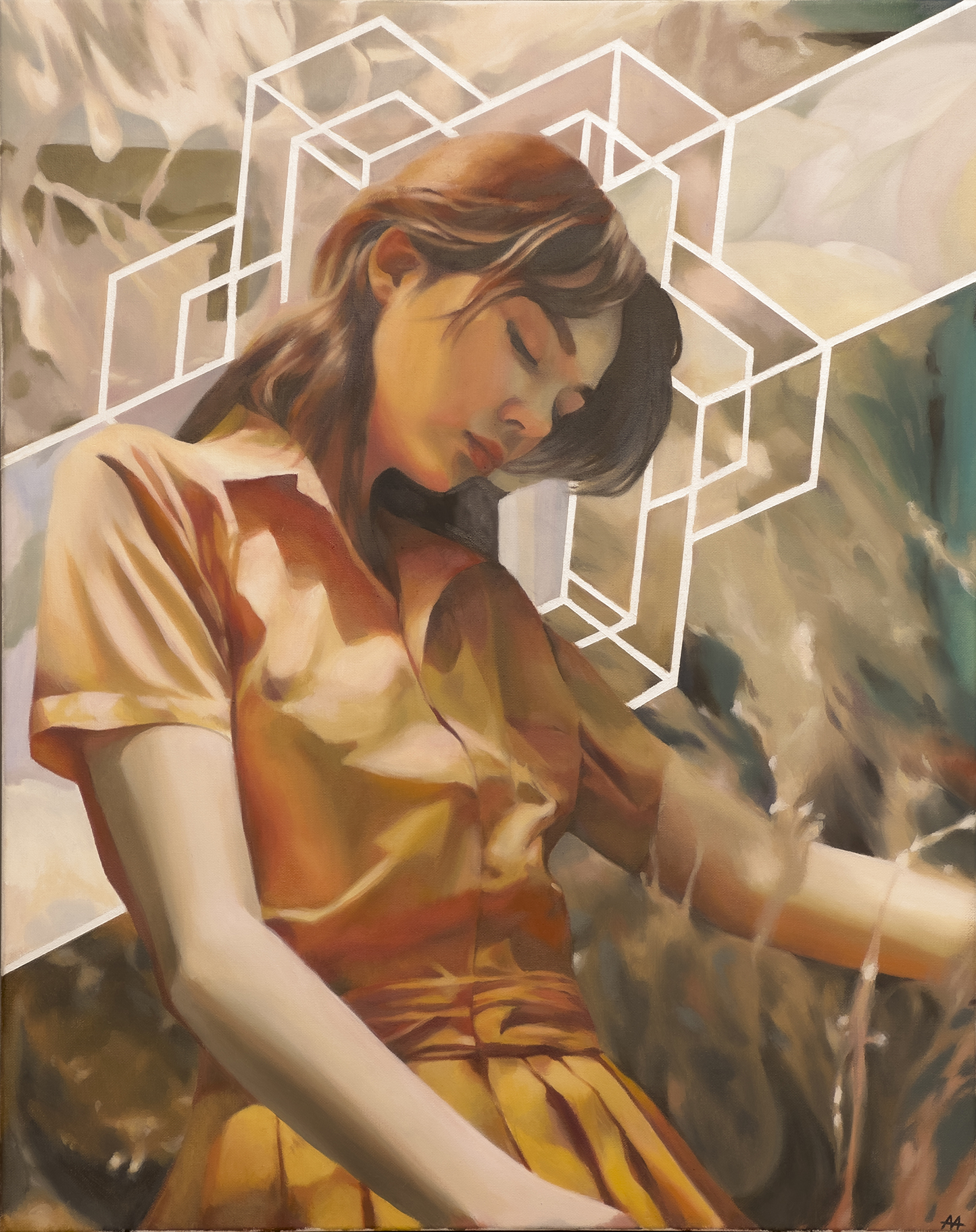 “Cradle” by Chris Le – Enhance your collection with “Cradle,” an original oil painting on canvas by Chris Le, framed with finished wood. Measuring 75 x 60 cm, this piece features a serene young woman in repose, set against intricate white geometric patterns.