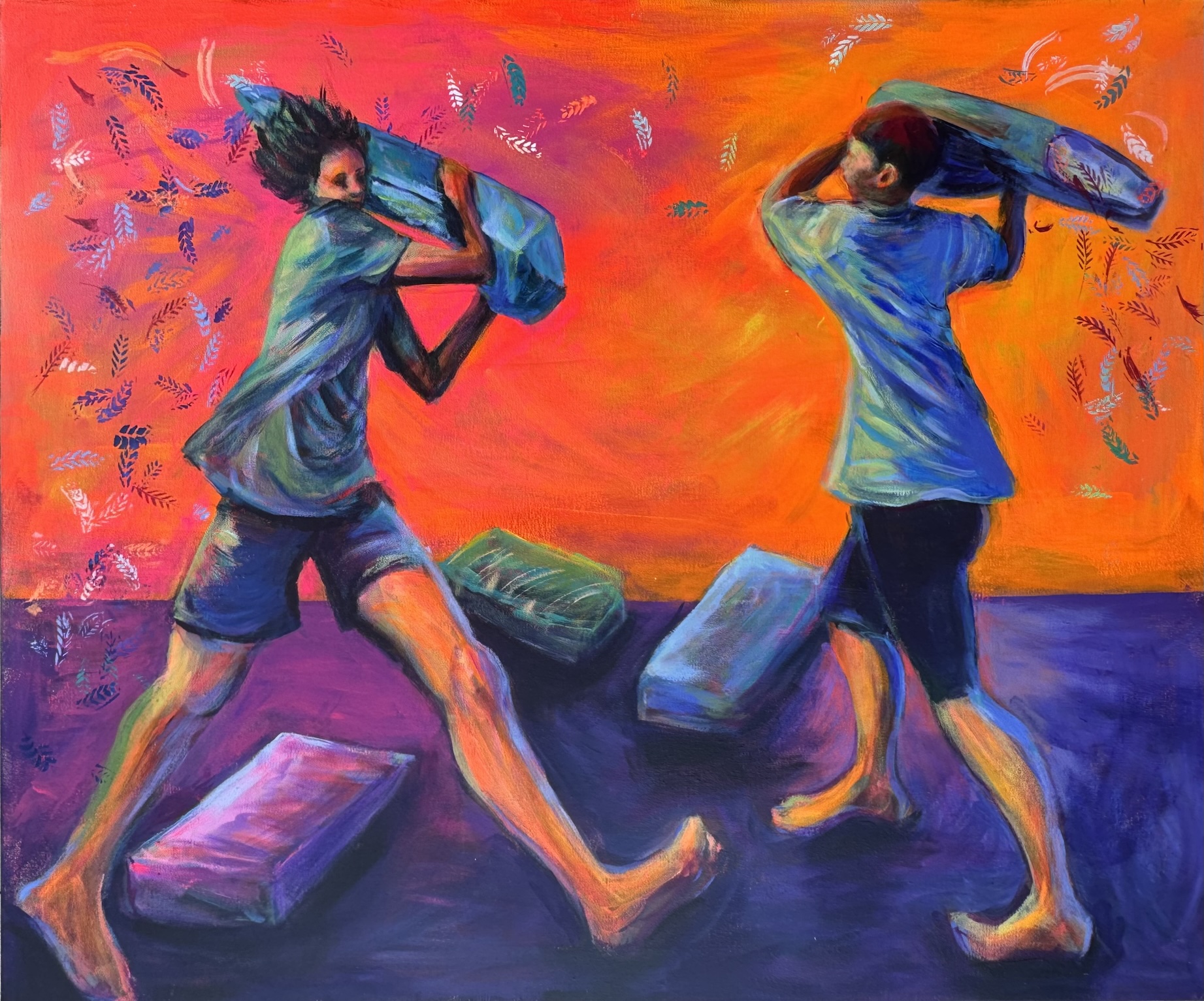 ‘Flogged with a Feather’ is an acrylic painting in landscape format. Sue was inspired by children enjoying some fun at Dopamine land, a recent show in Brisbane, ‘which is a multi-sensory experience that combines tradition mediums with innovative technology to activate your senses.’ These boys loved the pillow fighting under bright lights.