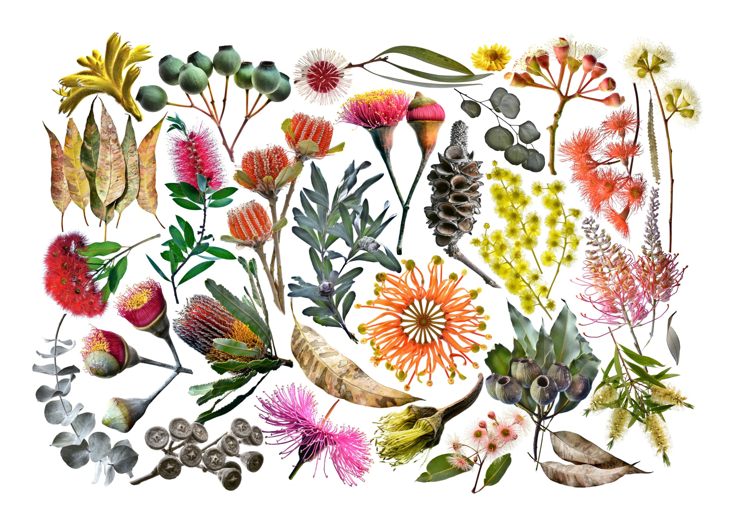 A photomontage of botanical beauties featuring images of Australian native flora . A bold and vibrant labour of love featuring Grevillea and Hakea to Wattle and Gum Nuts and everything in-between. These are images taken over many years, past and present and brought together as a celebration of our unique flowers and plants. Colourful and detailed, this is the sister piece to Art Prize finalist Australiana.