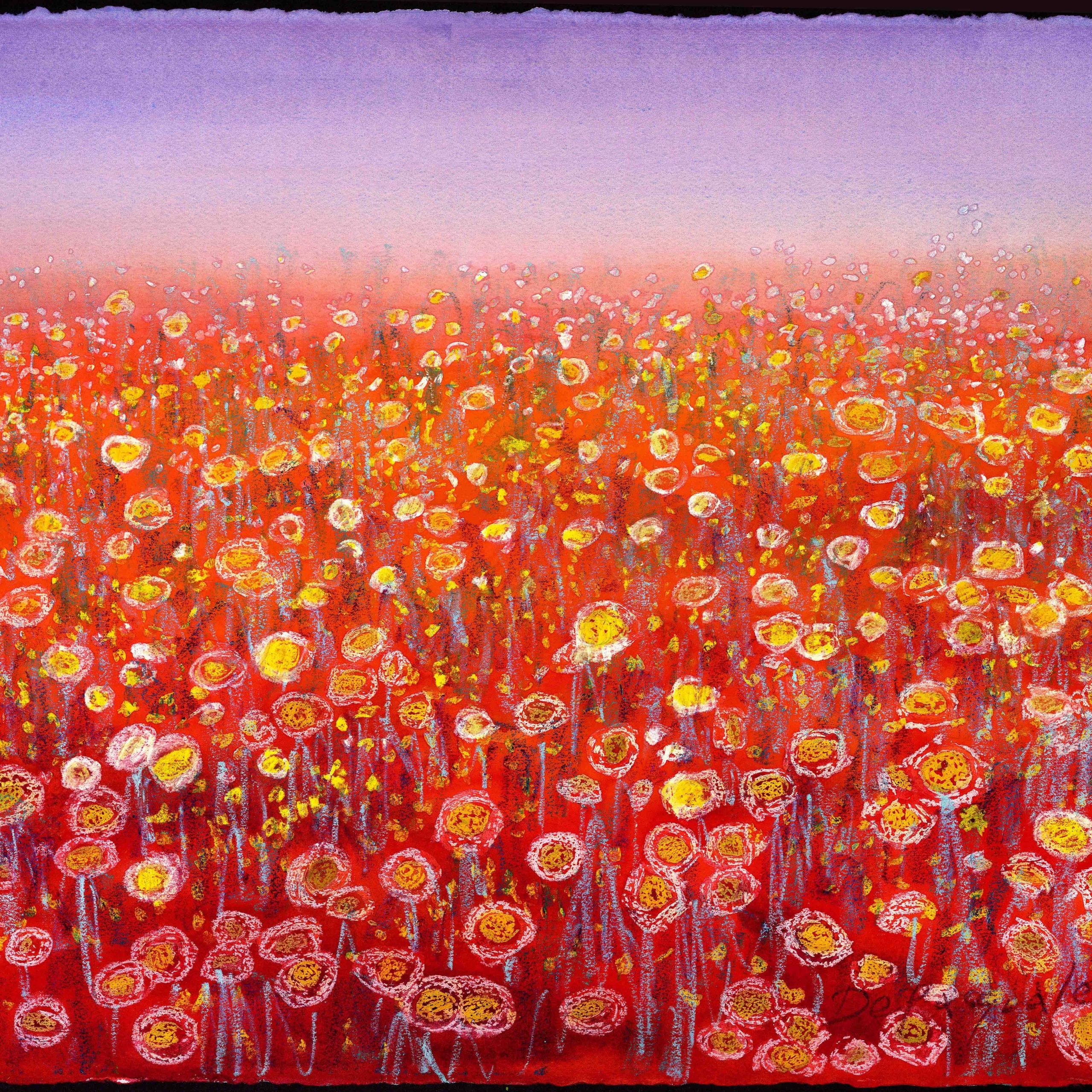 This is a Giclee limited edition number 34 /50, on fine art paper taken  from Faye De Pasquale’s original watercolour painting  and inspired by the Australian outback. Contemporary and delightfully decorative  paper daisies in outback .Slight hint of Gustav Klimt.