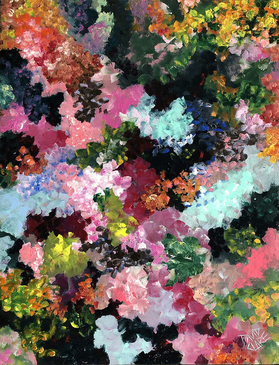 Abstract flower petals created by dabbing leftover paint from various paintings onto a spare canvas. Initially no plan for this, but it evolved as I added more paint over time.