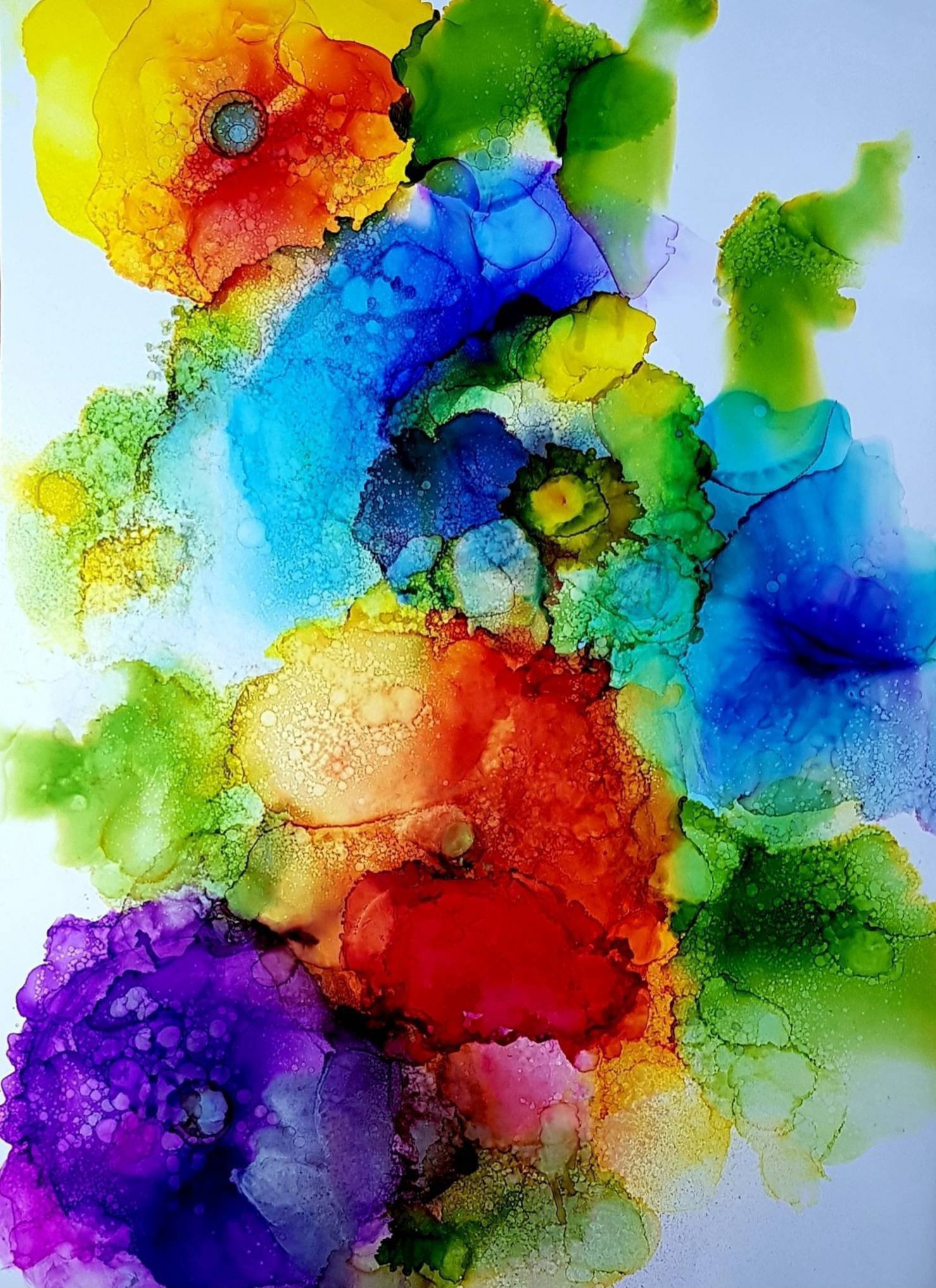 It is a hand worked, original, alcohol ink on yupo paper. There are no digital applications or brushes used to create this artwork. The colours are vibrant oranges, yellows, blues, greens and purples. My ink techniques uses the natural movement of the medium as it mixes with alcohol, or by blowing puffs of air onto the ink, or by tilting the paper, allowing the ink to run in the direction I want.