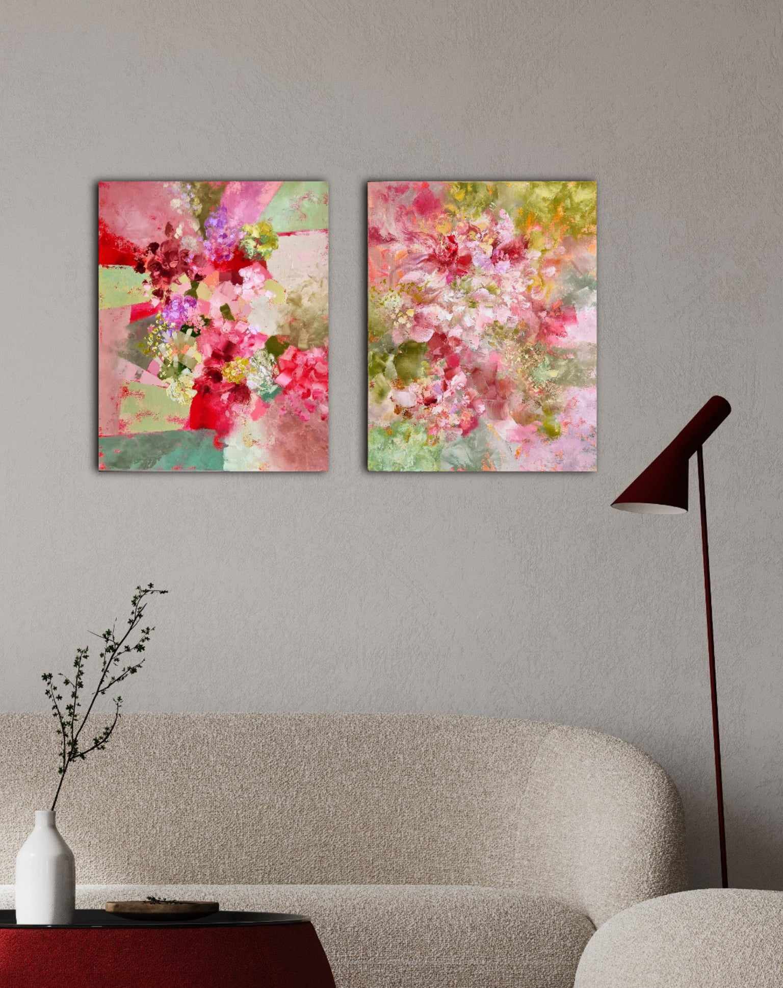 This is the listing for a set of two paintings. They feature impasto oil paint in a captivating blend of red, pink, blush and light green hues.The colours and the marks imply an abstract floral composition. It’s very light and airy, reminiscent of delicate petals floating in fresh breeze . The luscious, buttery texture of the oil paint adds a luxurious dimension to the artwork. The edges are painted to complement each individual artwork (there is a photo to show edges). Varnished and signed on back, this piece is ready for display. It comes with the Certificate of Authenticity.