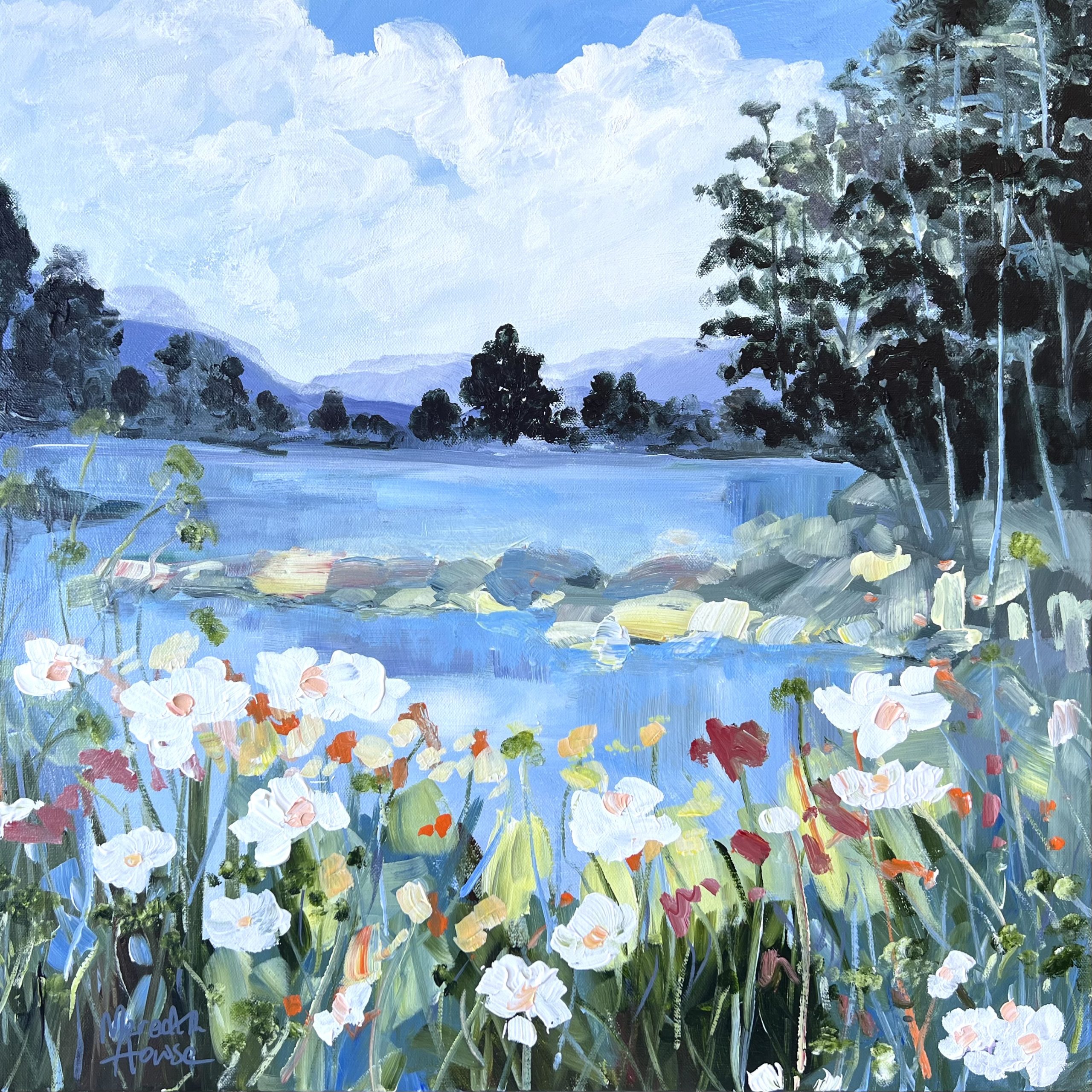 Floral Haven 2 by Meredith Howse captures flowers along a lake in a harmonious composition, lending an inviting ambiance to the scene.