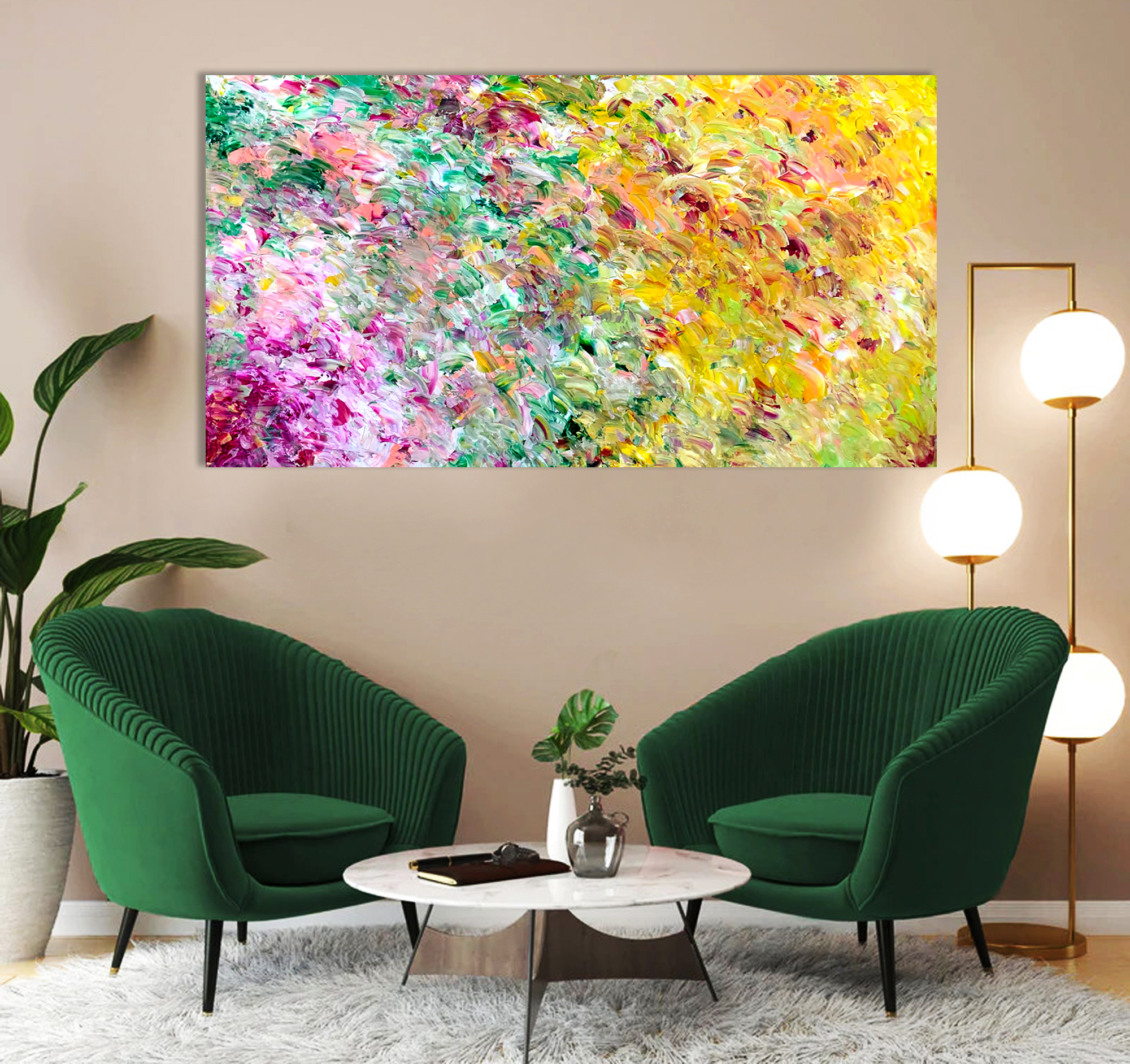 This artwork is painted on professional-grade canvas stretched and sealed with varnish. The canvas has dimensions 168 cm in width by 90 cm in height. The painting is painted in the same manner as the surface on the sides, giving a colour wrap.
